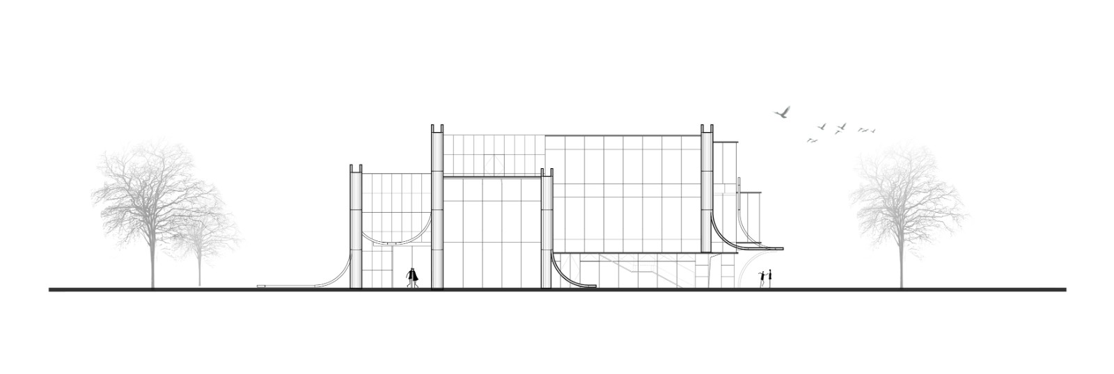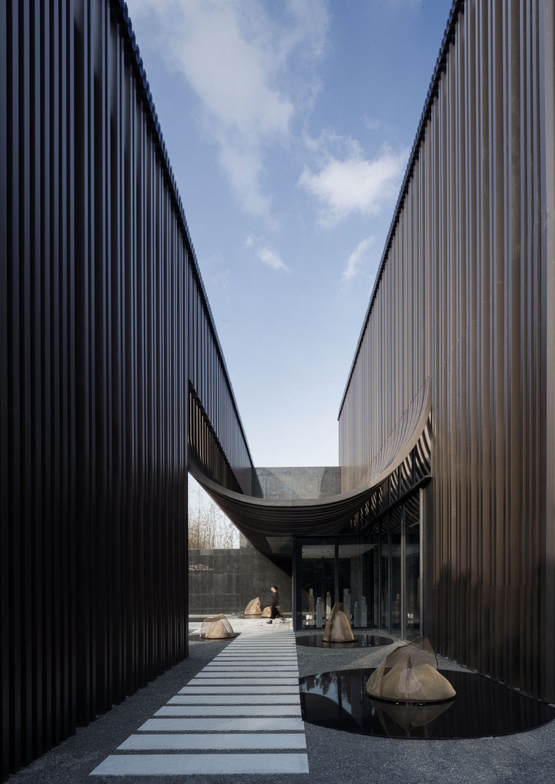 建筑面向运河展开,与河形成对话的关系,运河的波浪堆叠前行,拍打于建筑之上,形成五片前后错位、形态各异的浪型立面。与建筑玻璃体量交错咬合,虚实相生,让建筑与场所更加紧密地联系在一起。