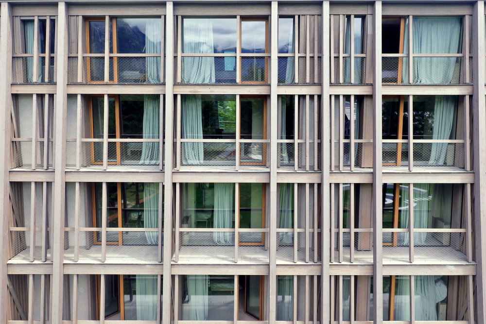 建筑基本体量被木质框架的新结构包裹着。除了建造新的阳台和改变整体体量外,该框架还为该地区频繁发生的地震提供了结构保护,并整合了排水沟、电线、避雷针和疗养设施。落叶松木覆层覆盖了其他新的外部元素,赋予酒店自然的外观。