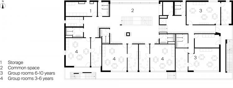 严格来讲,建筑包含了两个主要楼层以及一个屋顶区域。这样提供的空间可以给三组婴儿(0-3岁)、三组幼儿(3-6岁)和两组少儿(6-10岁)使用,总计可容纳142名儿童。换句话说,这个新建的幼儿园不仅可以满足当地社区的需求,还可以在更广的城市范围内提供服务。