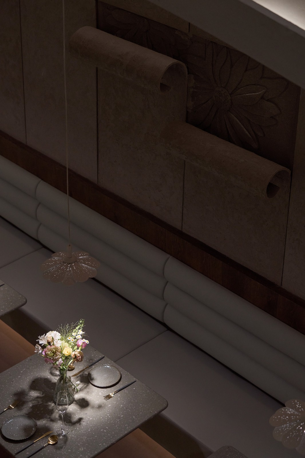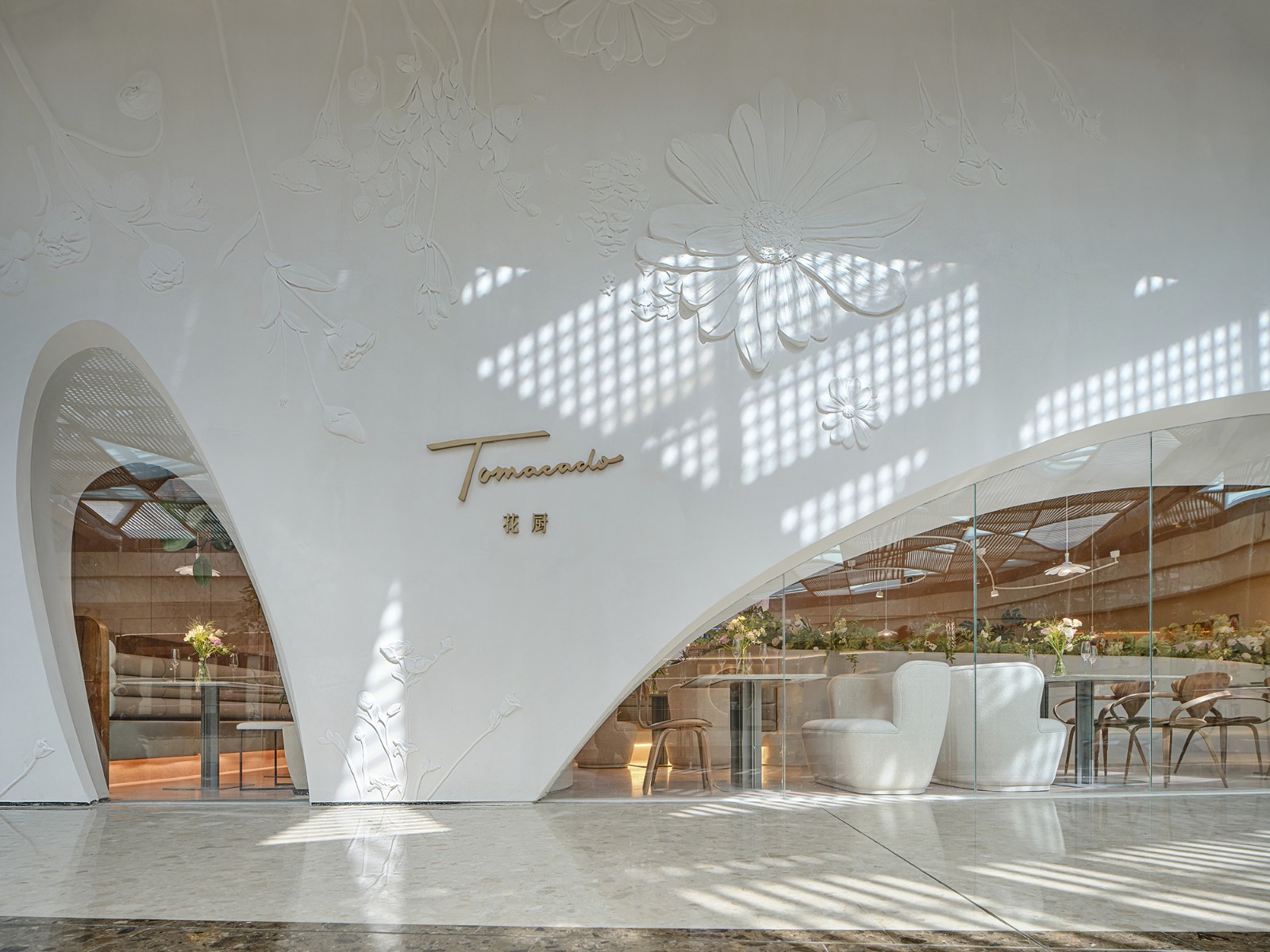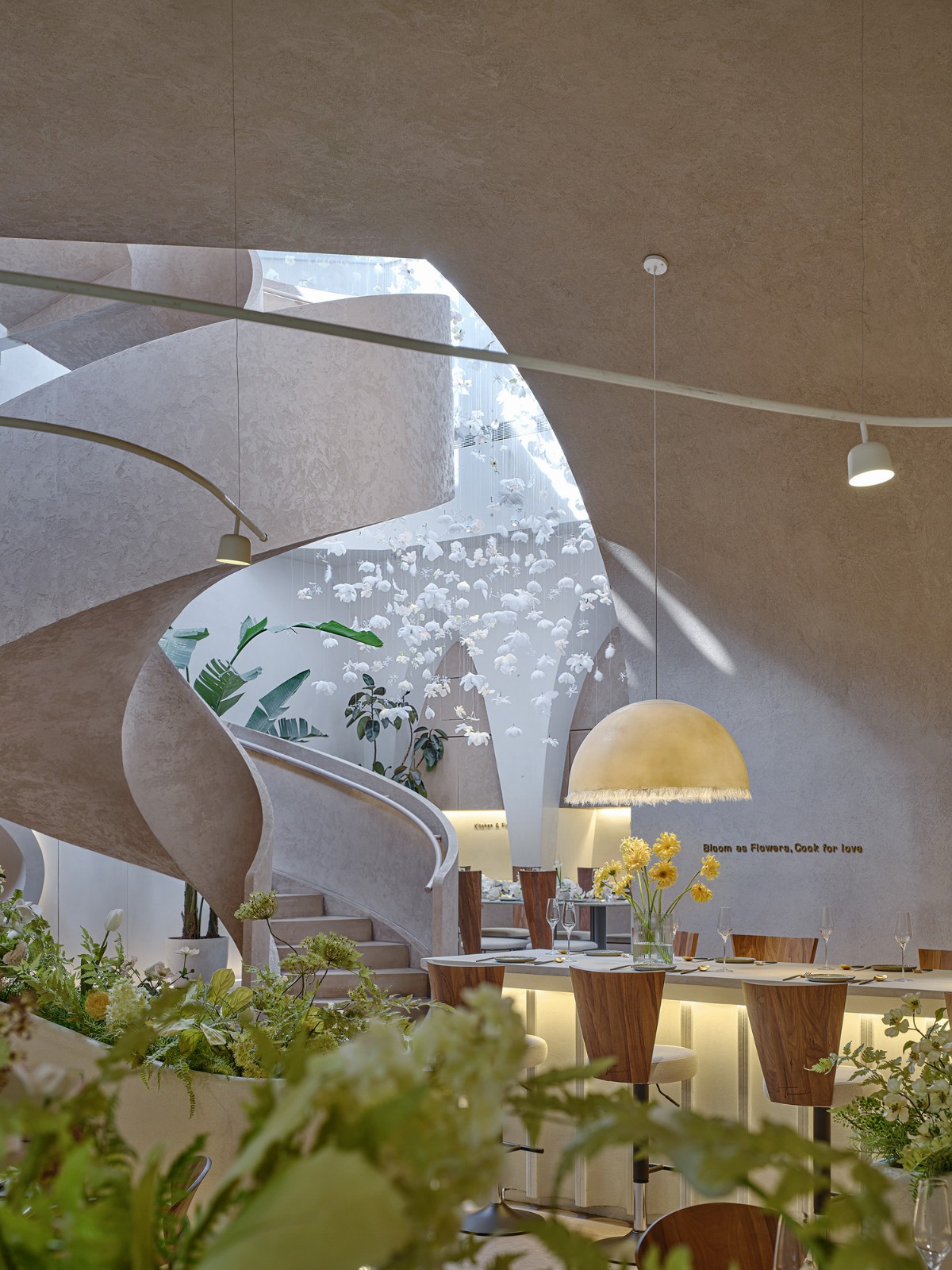 整个异化的构造形态为人与空间建立了联系,通过花瓣的形态建立了外立面的构造关系,通过石膏雕塑放大了花艺形态融入其中,通过物体和人的动线在空间中巧妙的引到空间深处,使空间具有浪漫氛围的同时,也能让客人在建筑空间内去感知自然变更所带来的光影乐趣。
