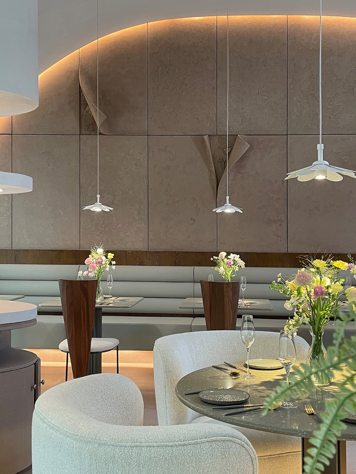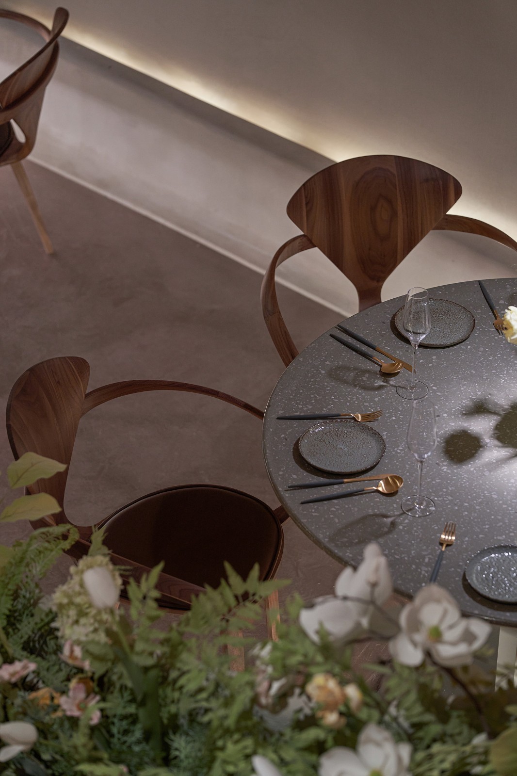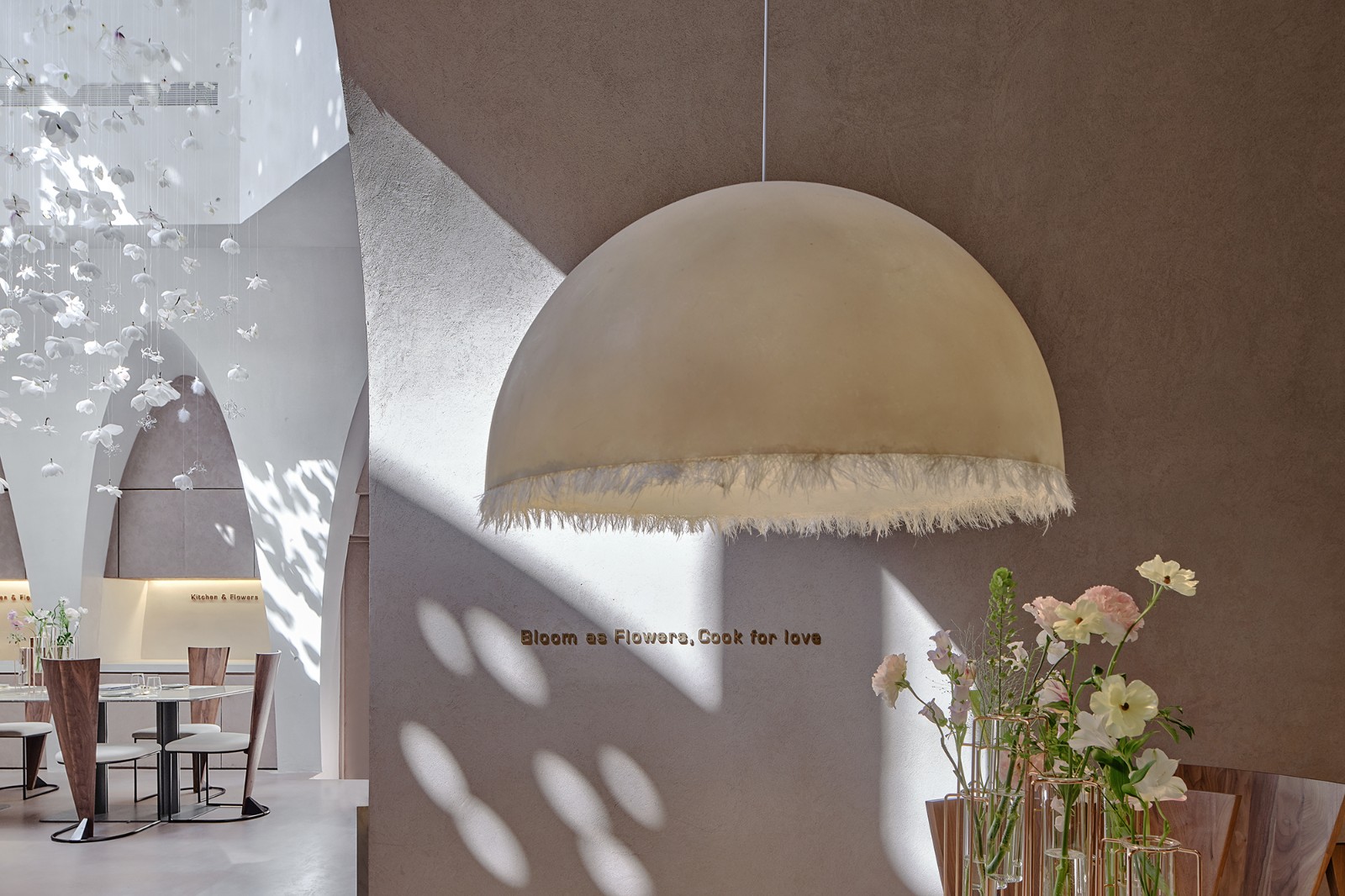 设计师希望通过设计手法把花的美丽最大限度的表达出来,与现代都市生活方式相结合,将空间、鲜花和美食融为一体,不断向客人诠释花厨的独特魅力。