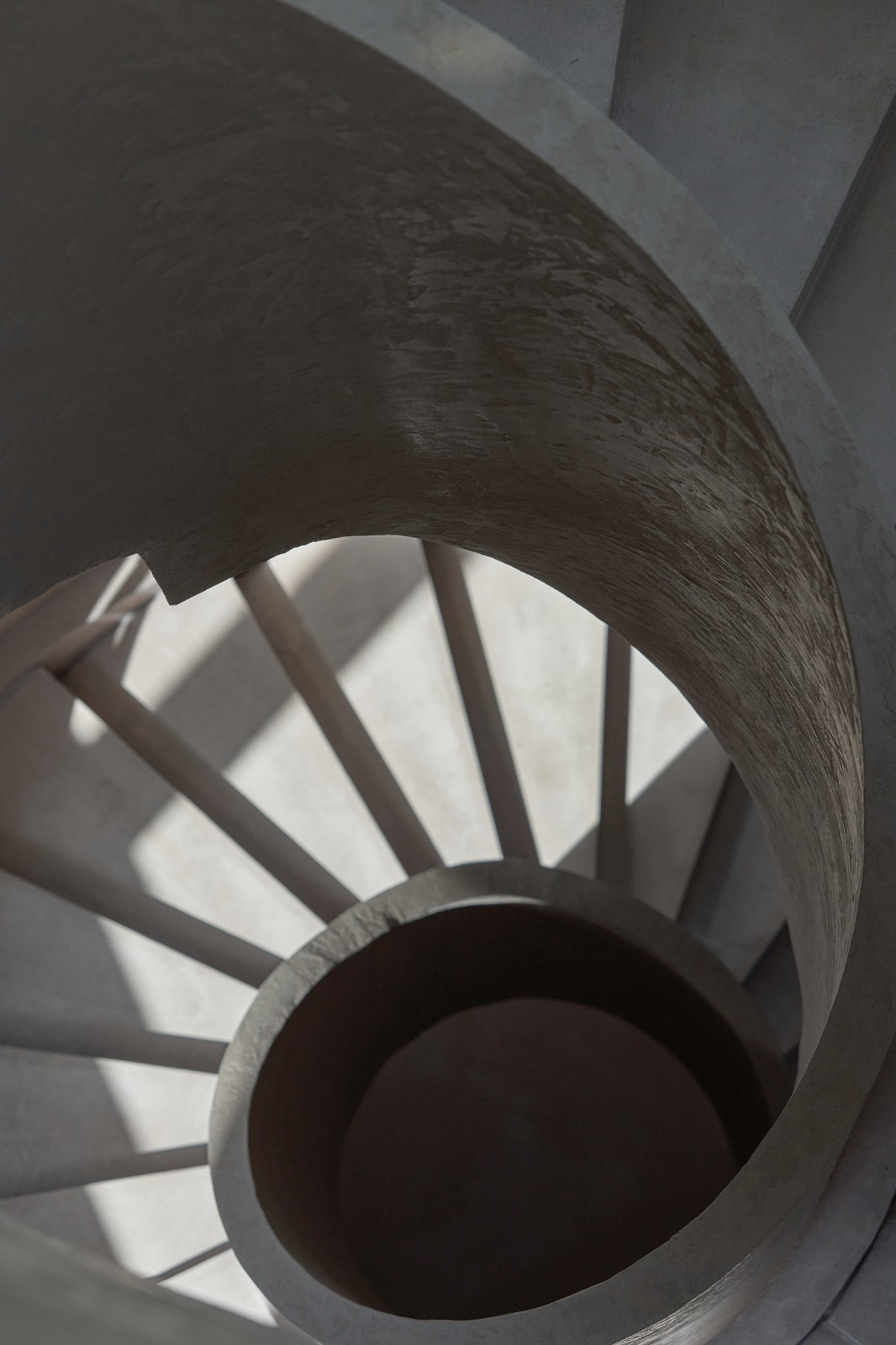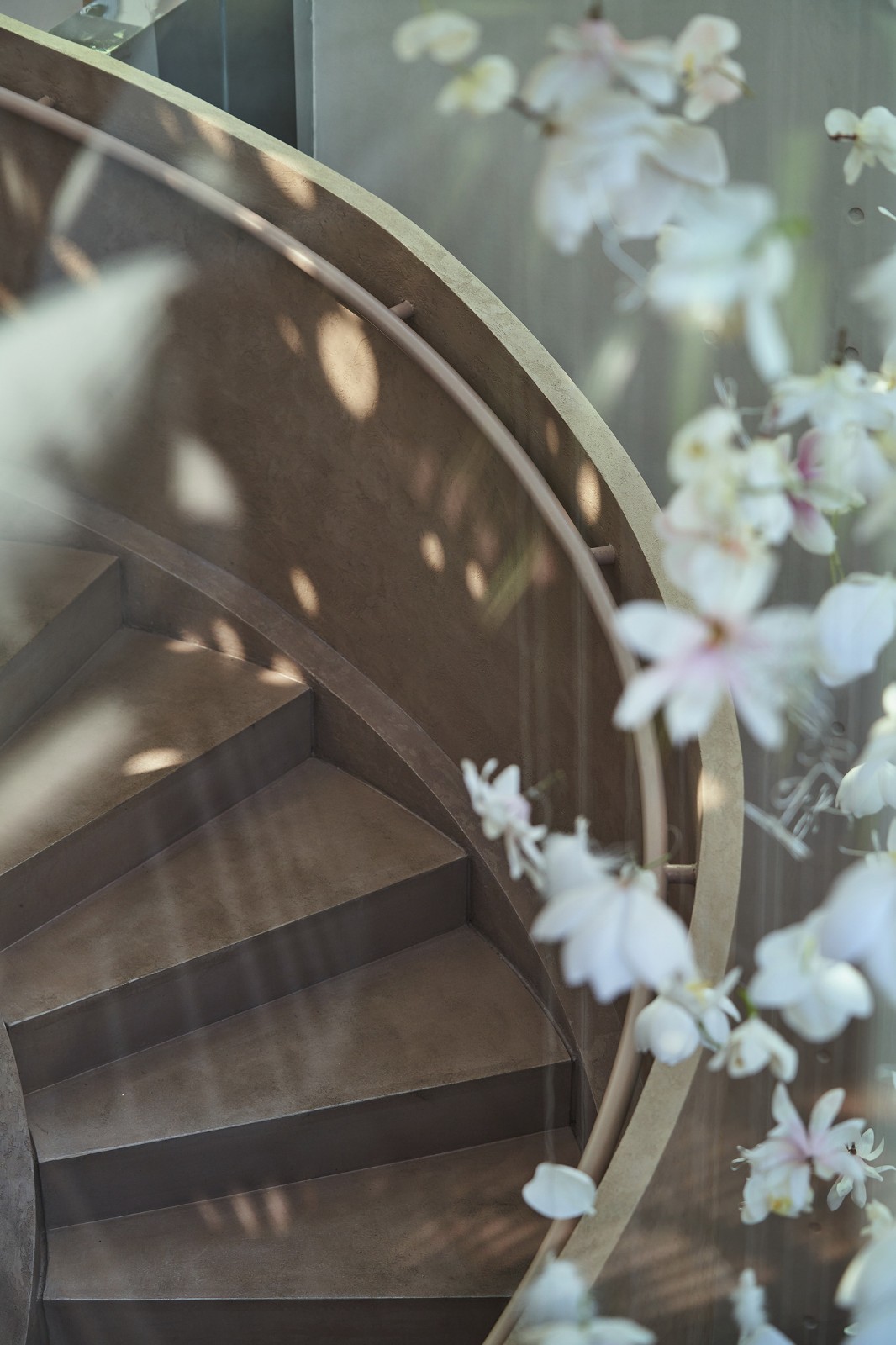以灰白色水泥作为主基调来衬托鲜花的艳丽,卷曲的形体连接了不同的空间,空间和建筑本身的材质语言非常简单,尽可能用一种语言一句话概括了所有想表达的外在和内在。