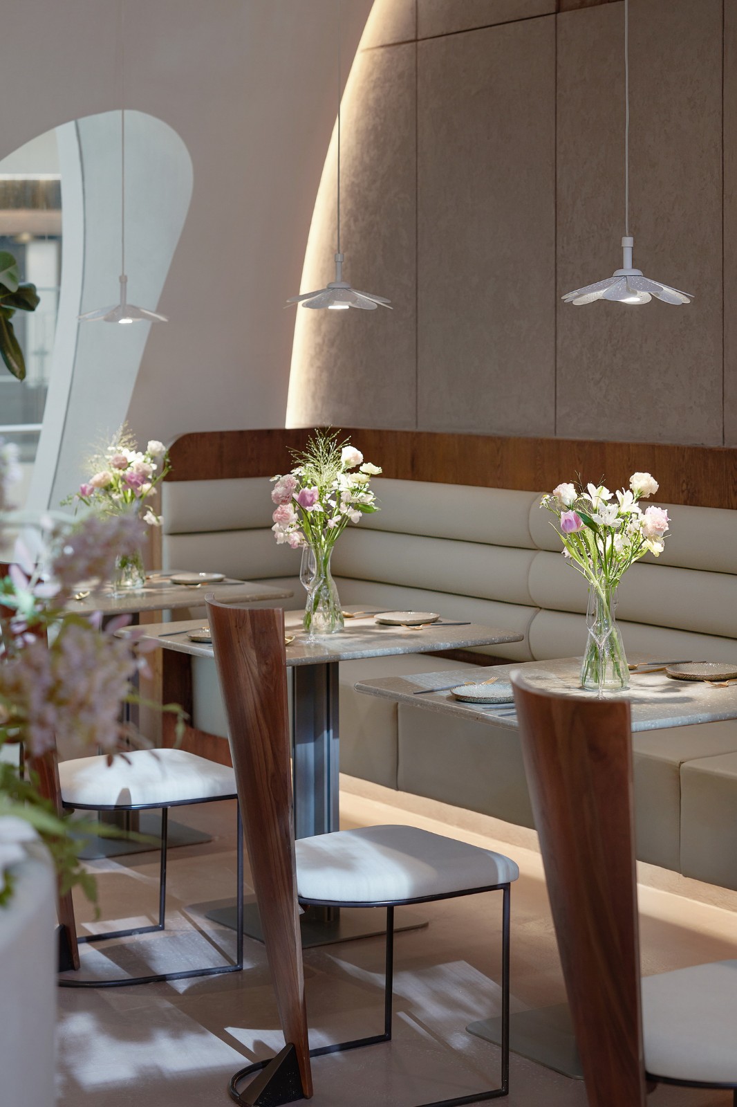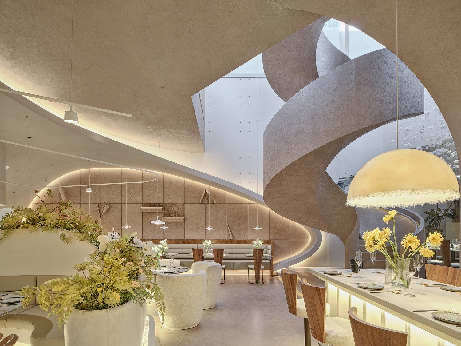 通过曲线结构连接了顶面、立面和地面,重构了一个充满律动且柔美的空间。