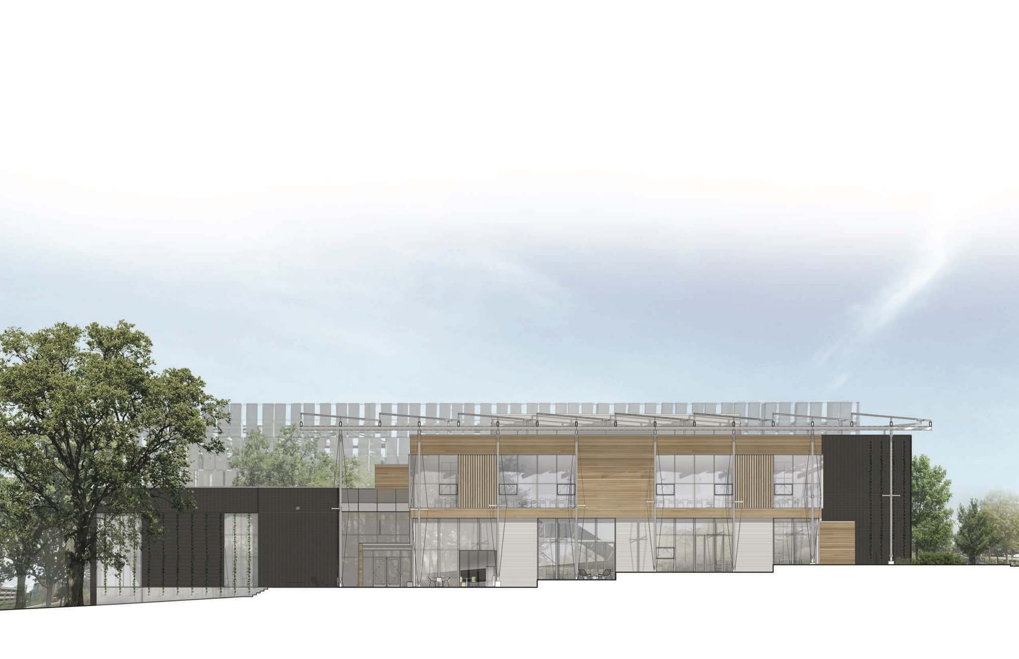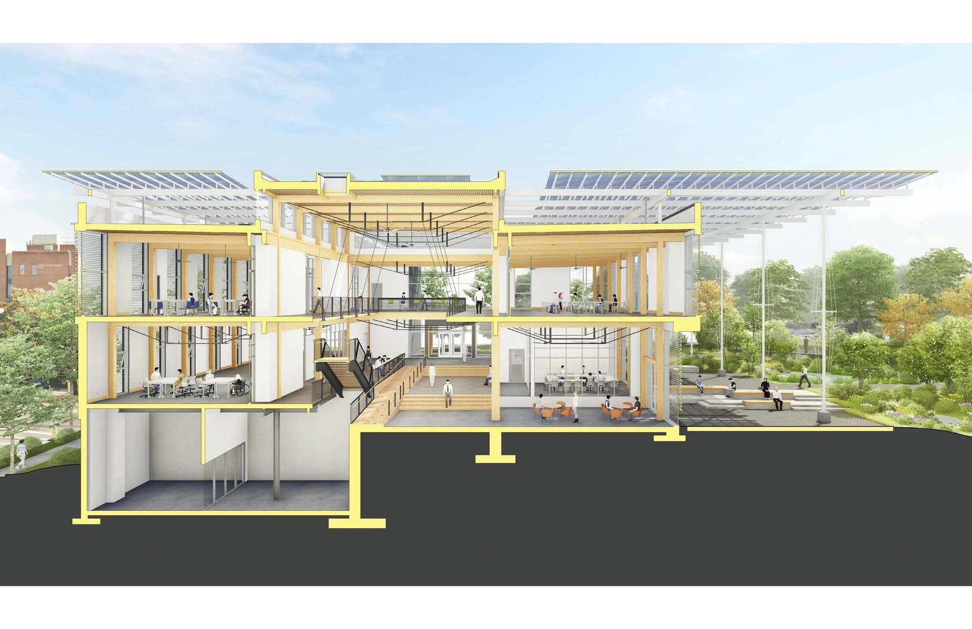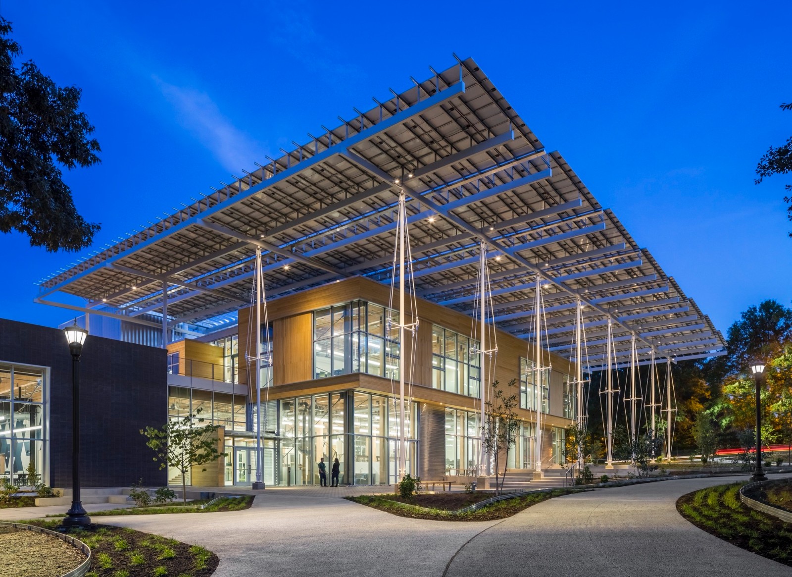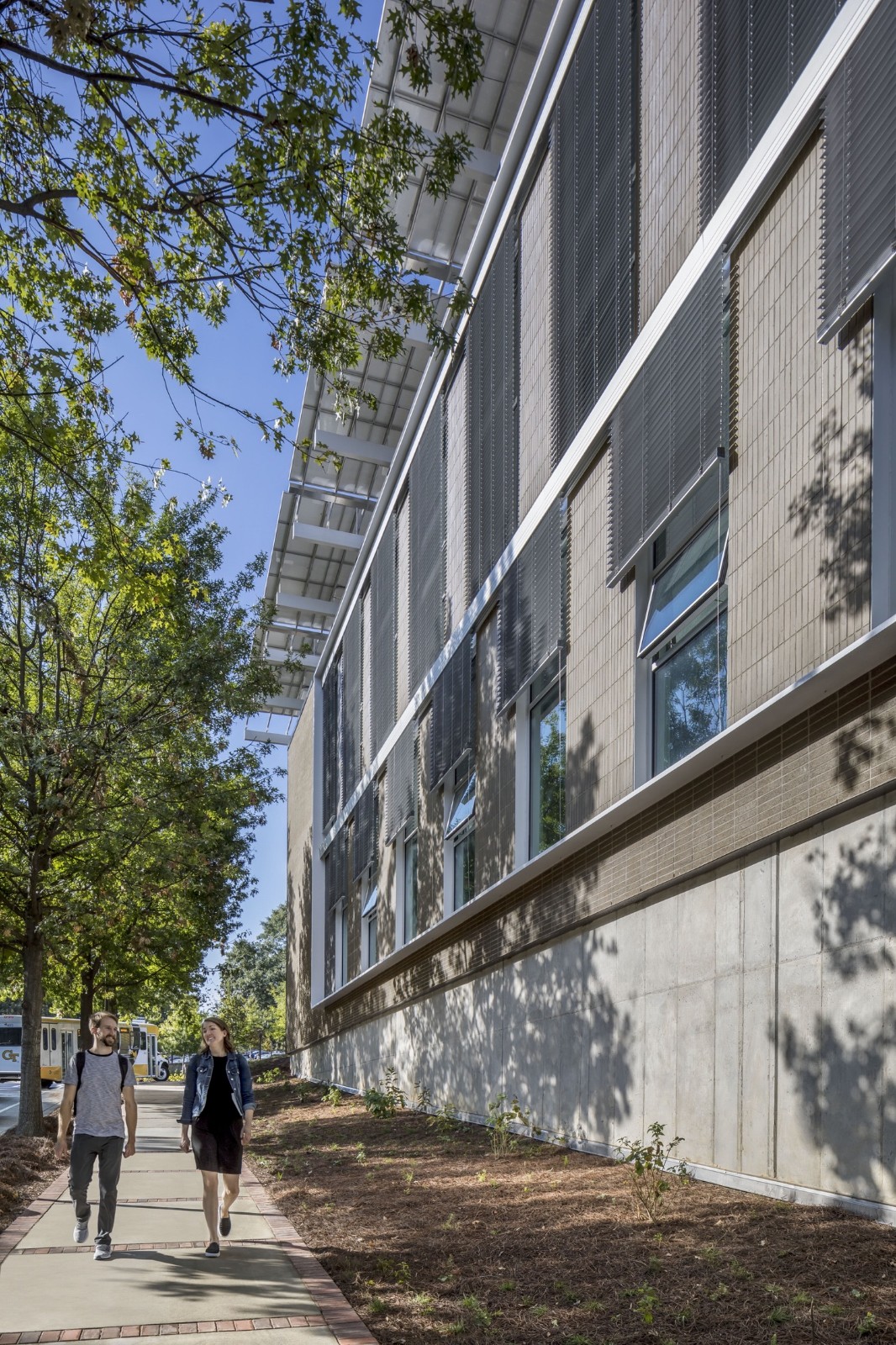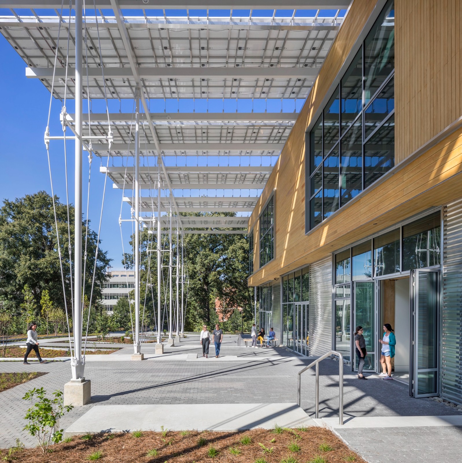 设计灵感来自美国南部当地的门廊。该项目为校园重新构想了这种地域性的无处不在的建筑元素。更新的门廊实现了传统的功能,即在建筑物周围营造凉爽的微气候,并模糊室内和室外的界限。此外,门廊被用来满足Living Building Challenge的严格要求。光伏顶棚创造了该建筑超出100%的能源需求,并能积累足够的雨水来满足建筑中100%的用水需求。
