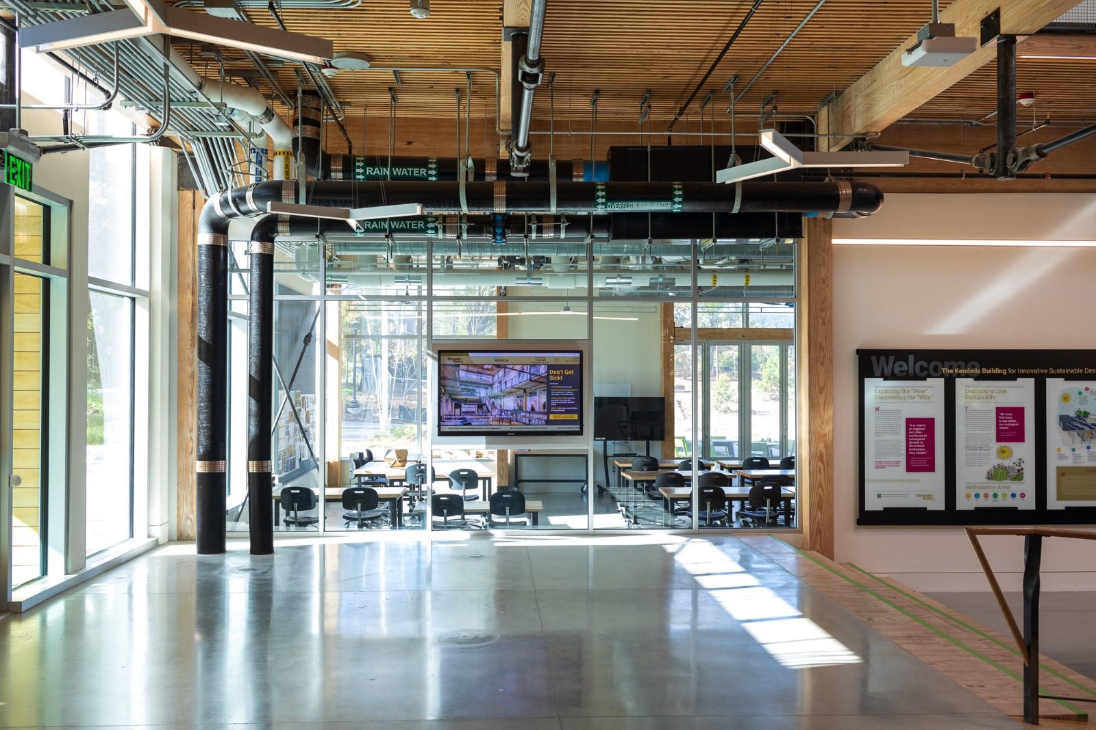 2.5万英尺长的2×4材料是从亚特兰大的生命周期建筑中心(Lifecycle Building Center)回收的,该中心从废弃的电影布景中获取板材。平台木板由当地非营利组织GeorgiaWorks!的学徒组装,提供宝贵的商业技能。新木材的下脚料用于制造中庭的三级座椅台阶。除了结构木材外,从校园和乔治亚州南部被风暴砍伐的树木中回收的木材还用于制作台面和家具。Kendeda大楼中所有使用的水都来自光伏顶棚收集的雨水。
