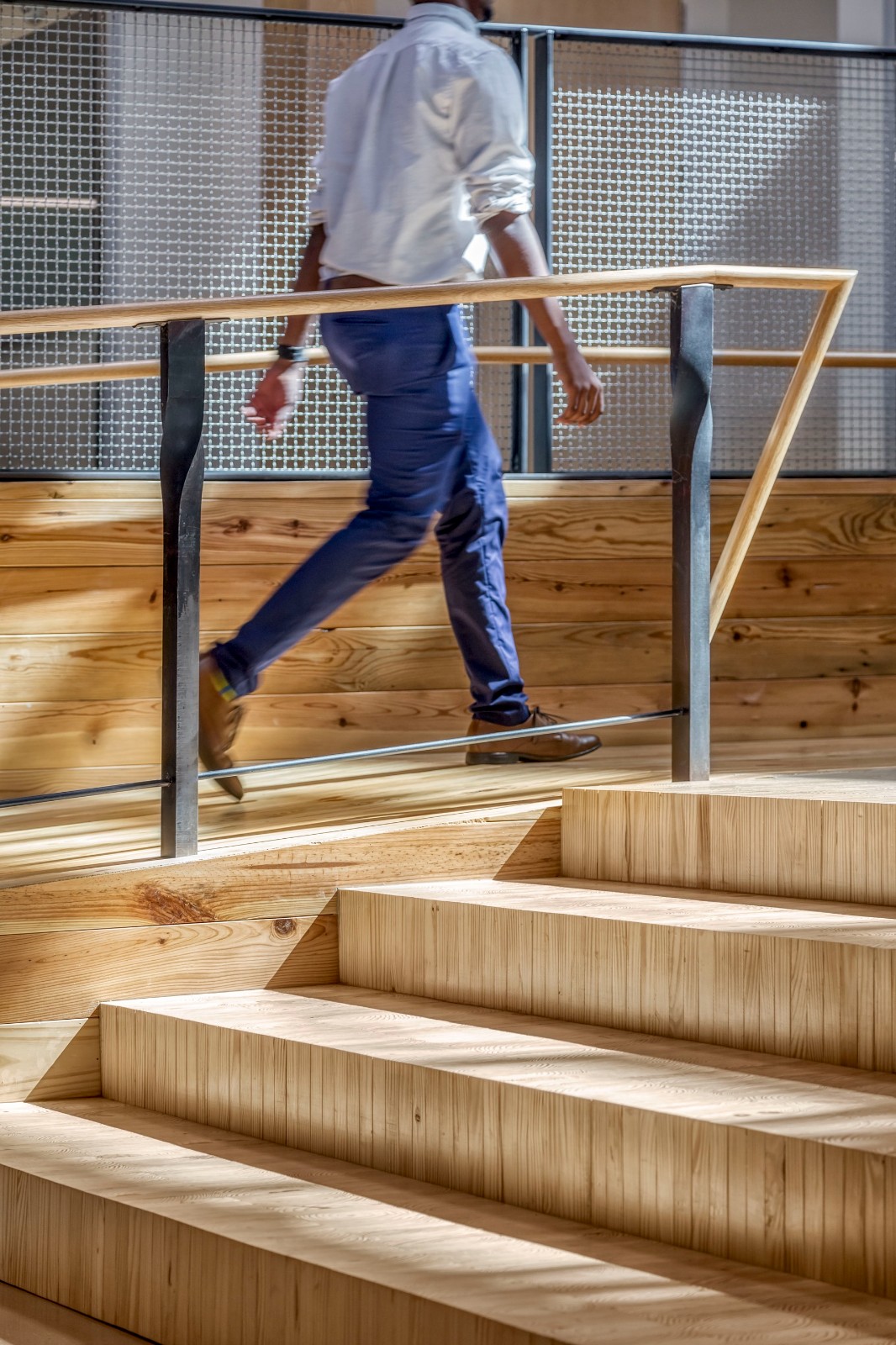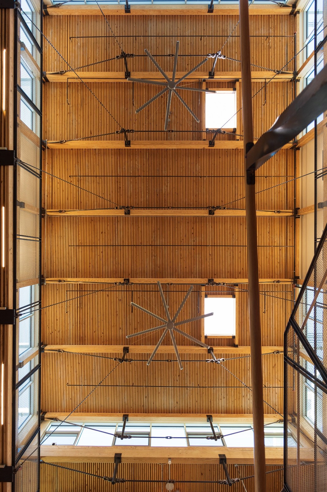 从这所大学1880年代最早的承重砖石和木结构建筑以来,Kendeda大楼是第一座木结构建筑。与混凝土和钢系统相比,选择大块木材是因为其隐含碳足迹要小得多。但如果在这样的空间中仅靠木材支撑,是具有挑战性的,所以项目中使用了带有钢构的胶合叠层支撑柱,来实现较大空间的跨度。这种混合方法减少了所需的木材总量,同时使建筑功能区块的流线安排更加高效。支撑和横向元素完全暴露,使建筑成为一种教学工具,并定义了内部环境的特征。钉子层压木板在场外镶板并用吊车固定到位。