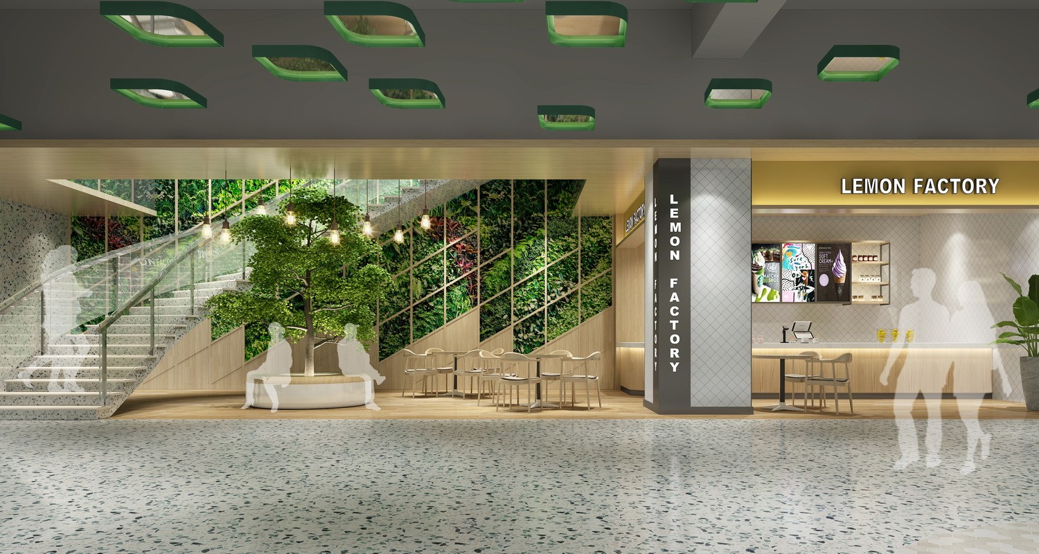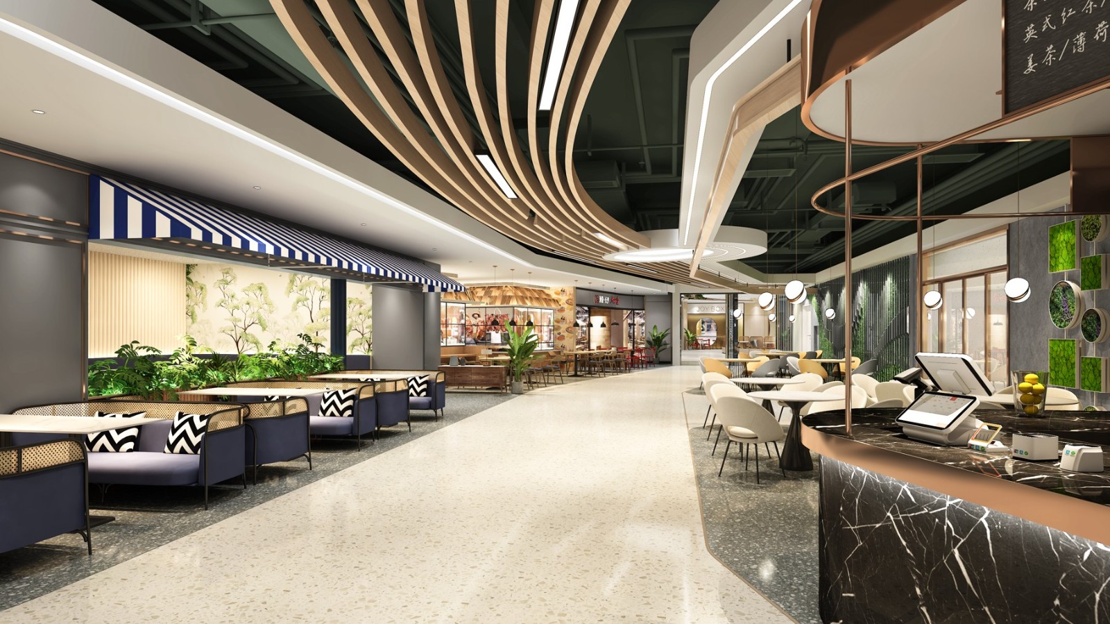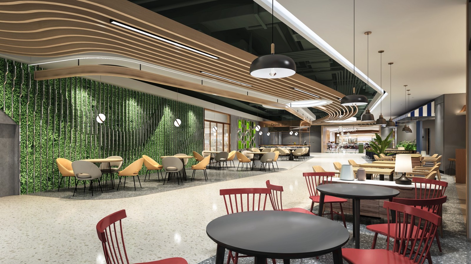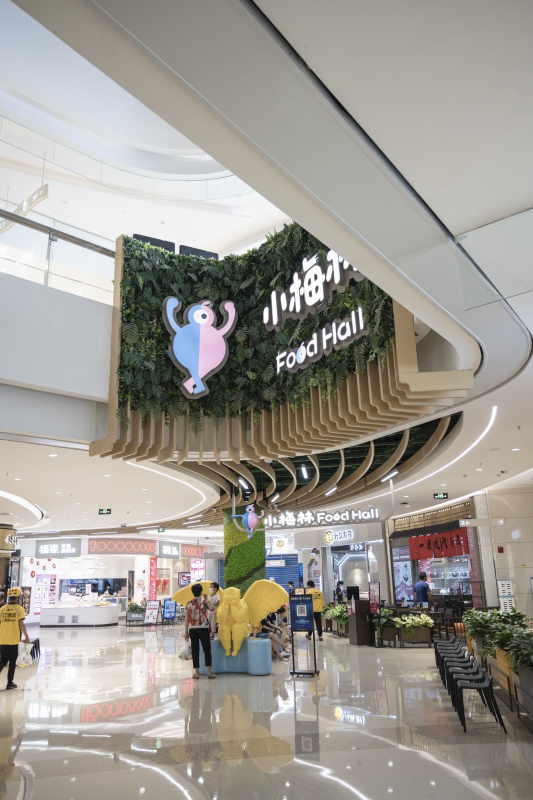 漫步游园遇到蜿蜒的小路和静静淌的溪流,天花上代表路和溪流的曲线贯穿整个小梅林。水利万物而不争的特点在这里体现得淋漓尽致,我们将溪流和小路搬到头顶,将绿植围绕在身侧,将石凳置于庭院,将鹅卵石踩在脚下,整个空间透露出一种和谐轻松的自然气息。