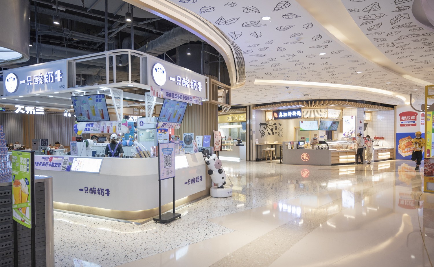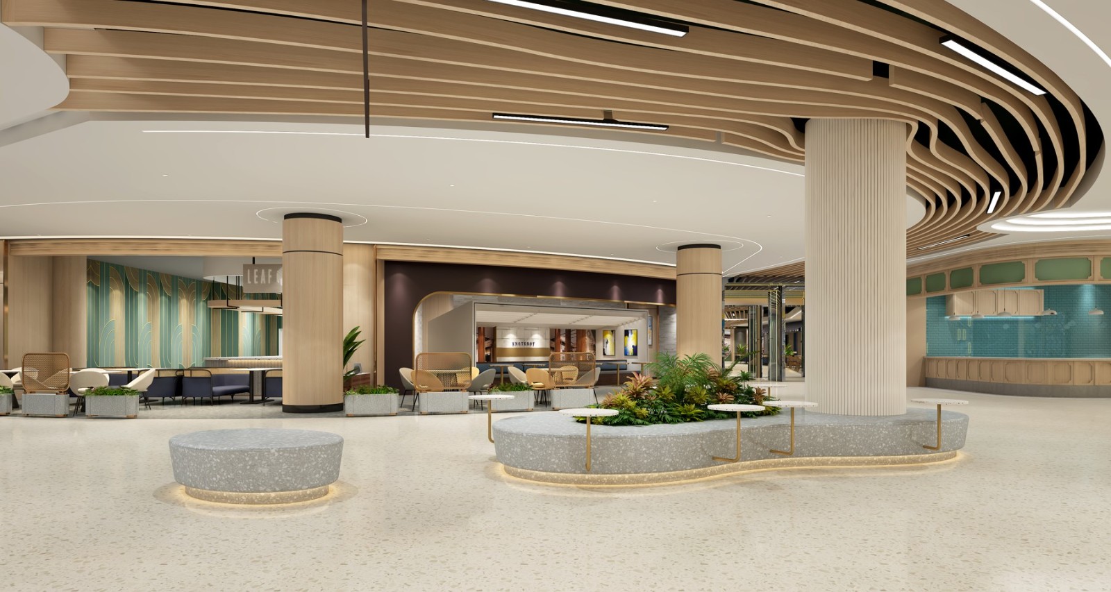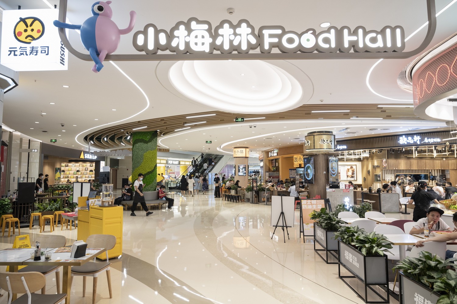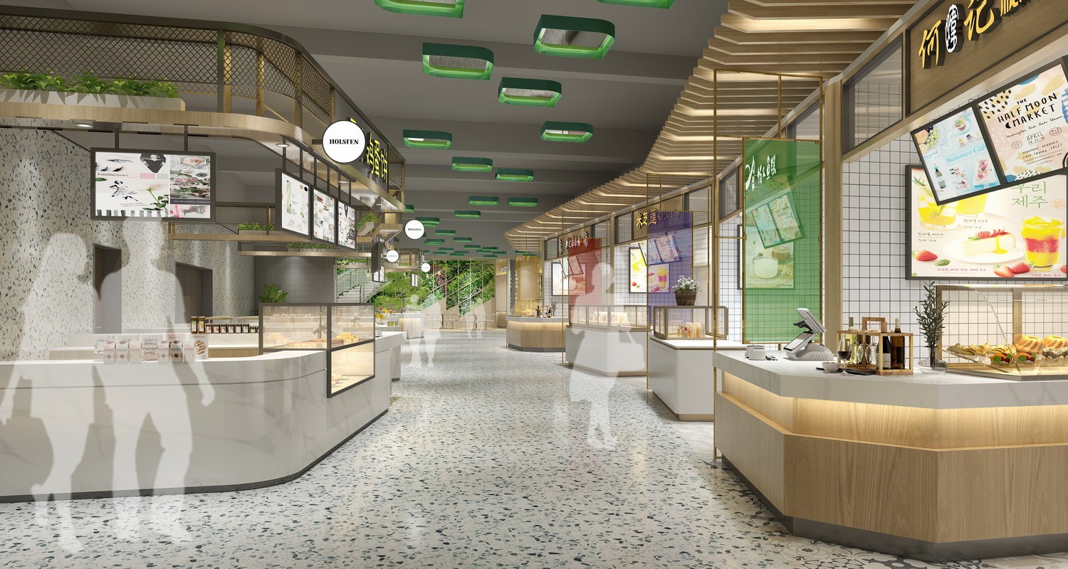 漫步游园遇到蜿蜒的小路和静静淌的溪流,天花上代表路和溪流的曲线贯穿整个小梅林。水利万物而不争的特点在这里体现得淋漓尽致,我们将溪流和小路搬到头顶,将绿植围绕在身侧,将石凳置于庭院,将鹅卵石踩在脚下,整个空间透露出一种和谐轻松的自然气息。