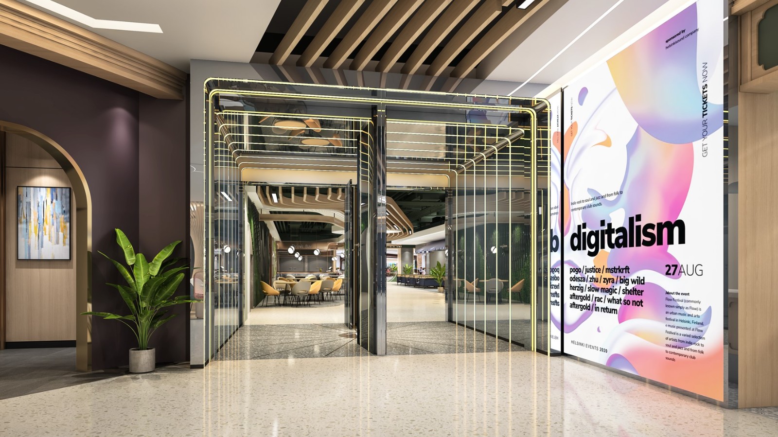 除此之外,我们还将现代科技元素融于其中,通过灯光通道打造科技感,且世界上扩大空间,将消防门也变成一道美景,我们穿过科技通道,走进去就是“漫步游园”的自然。