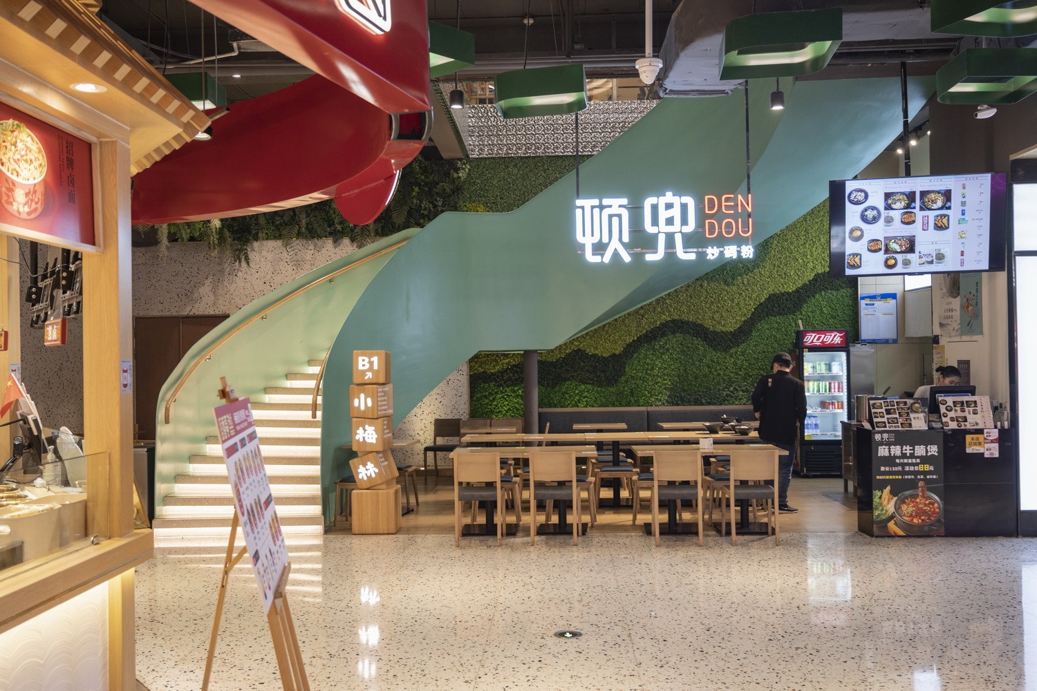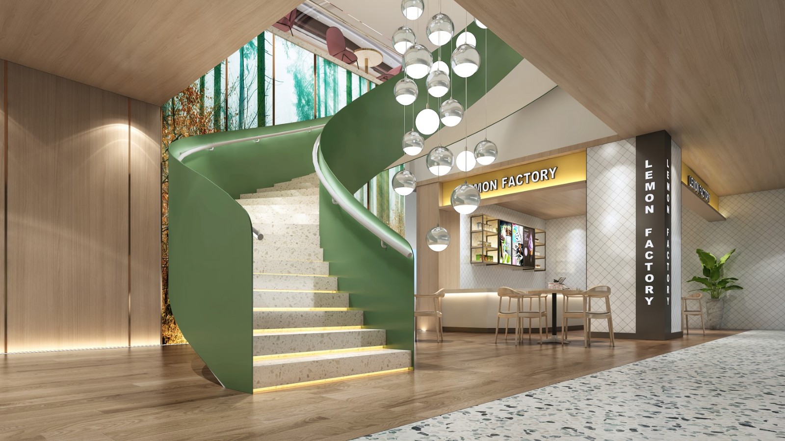 两部楼梯都采用异形的结构,将“蜿蜒”贯彻到底,缓步上行方有豁然开朗之感,才能窥得上一层空间的面貌。且楼梯两侧或绿植环绕或绿色扶手,将山间蜿蜒小路搬到喧哗闹市之中,闹中取静,颇有一种大隐隐于市的风范。