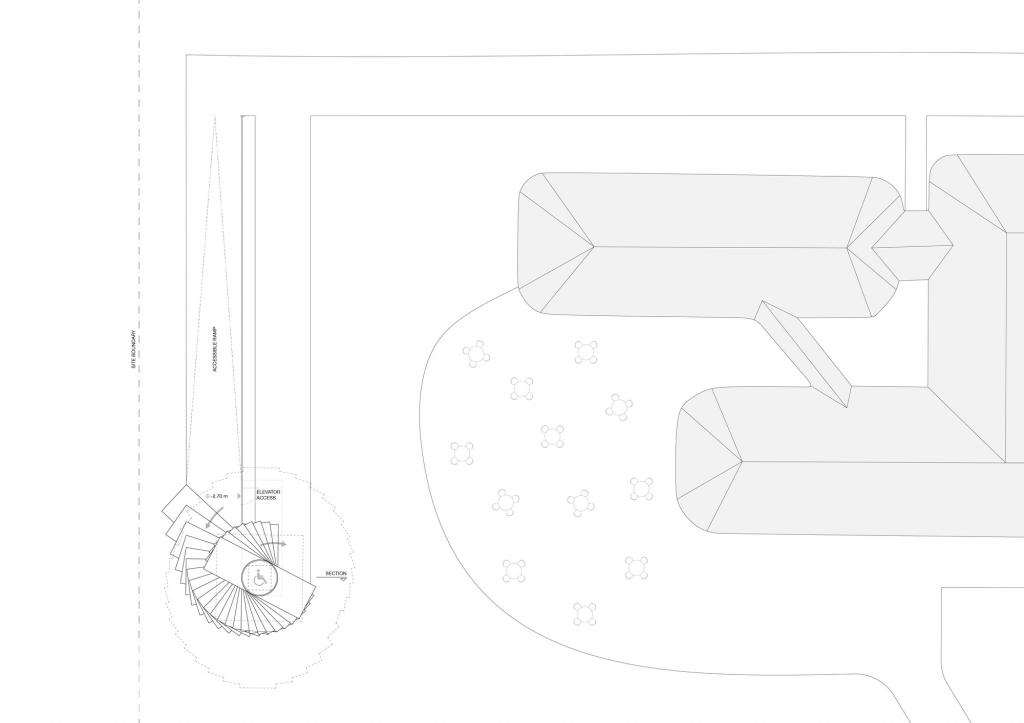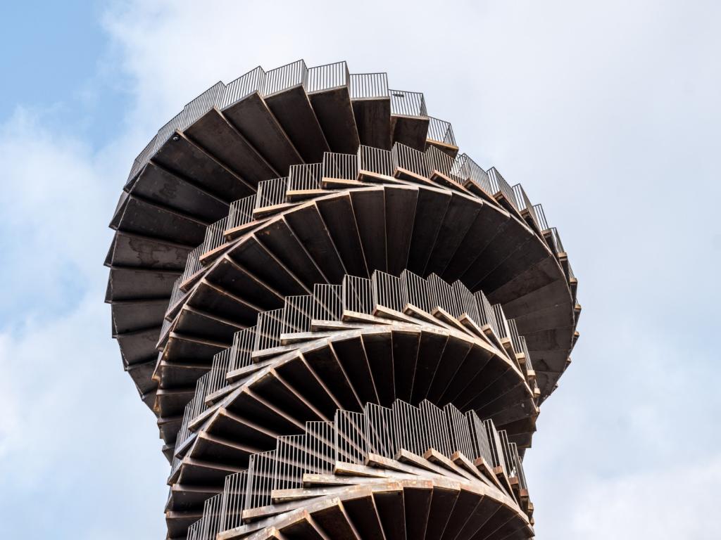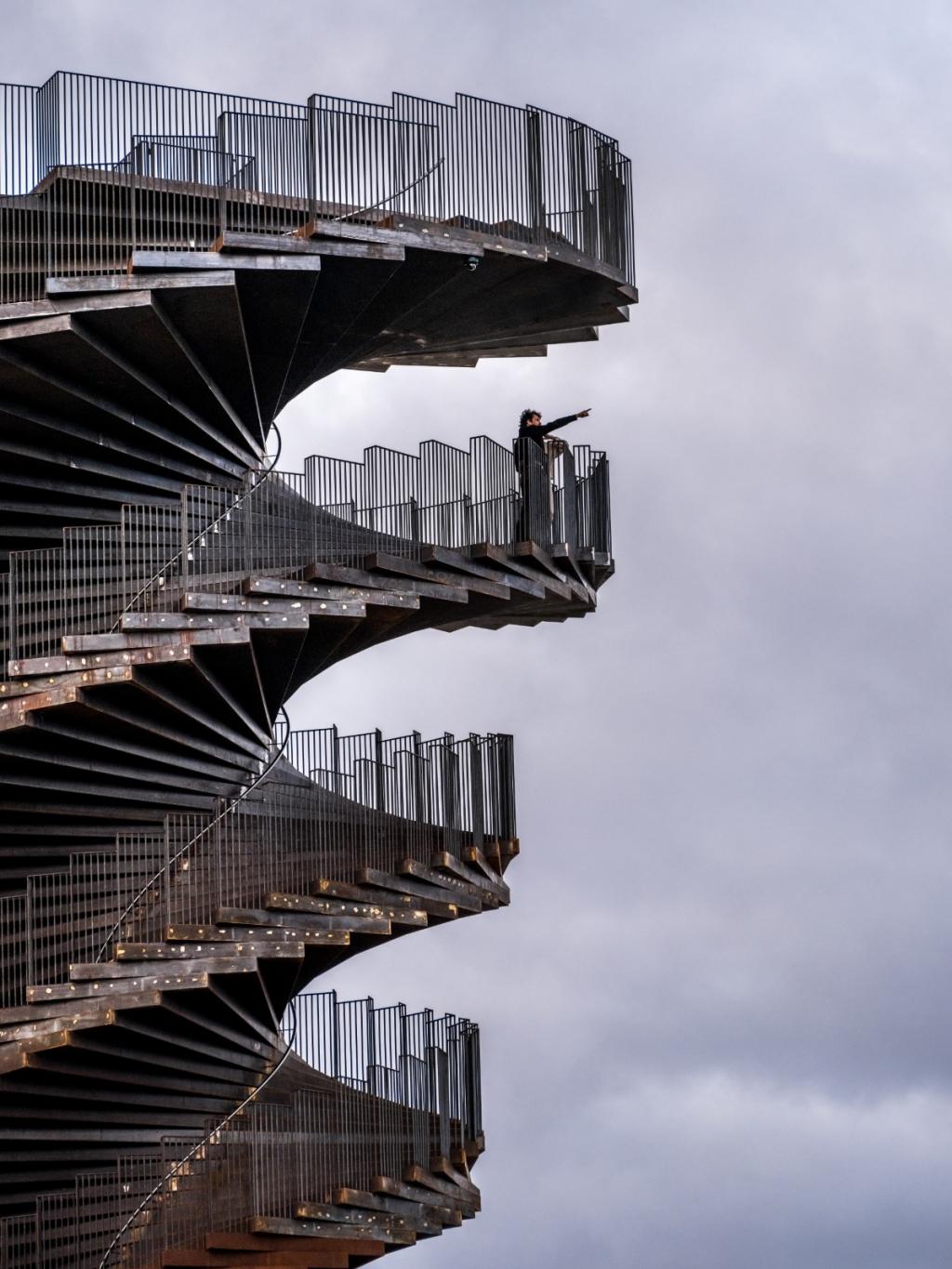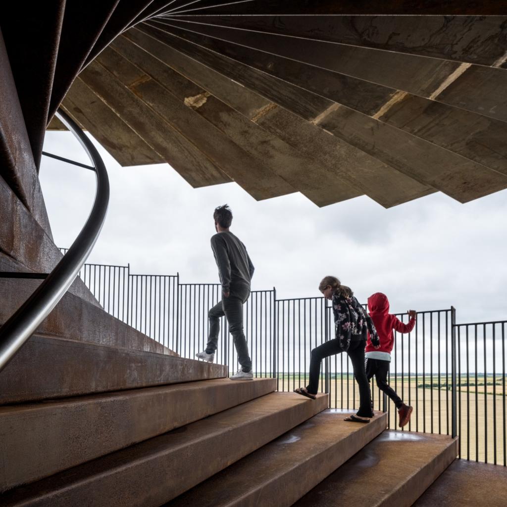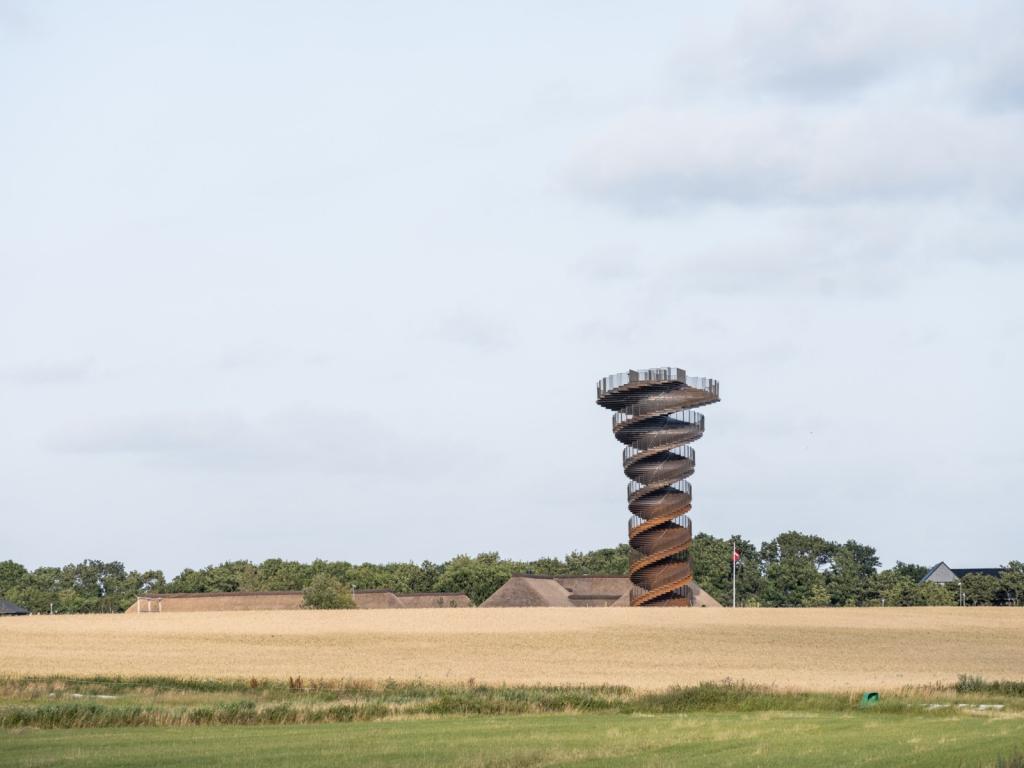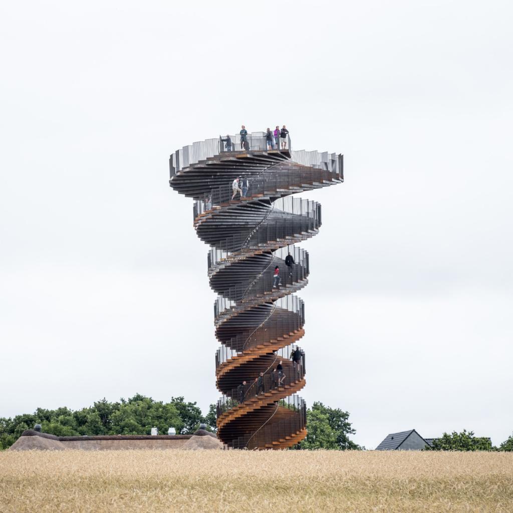 由于我们所生活的地球表面具有一定的曲率,因此当游客逐渐步行至塔顶时,他们所看到的地平线视野也会渐渐拓宽。在这座塔下,游客们将能看到4公里内的景观。而当游客攀爬至塔顶时,他们则可以看到18公里内的风景。此外,建筑的楼梯宽度随着水平的高度上升而逐步拓大,最后在塔顶形成了一个110平方米的观景台,以此让观览者可以看到埃斯比约市、罗姆岛和叙尔特岛以及瓦登海至北海的风景。——BIG建筑师及合伙人,Jakob Lange