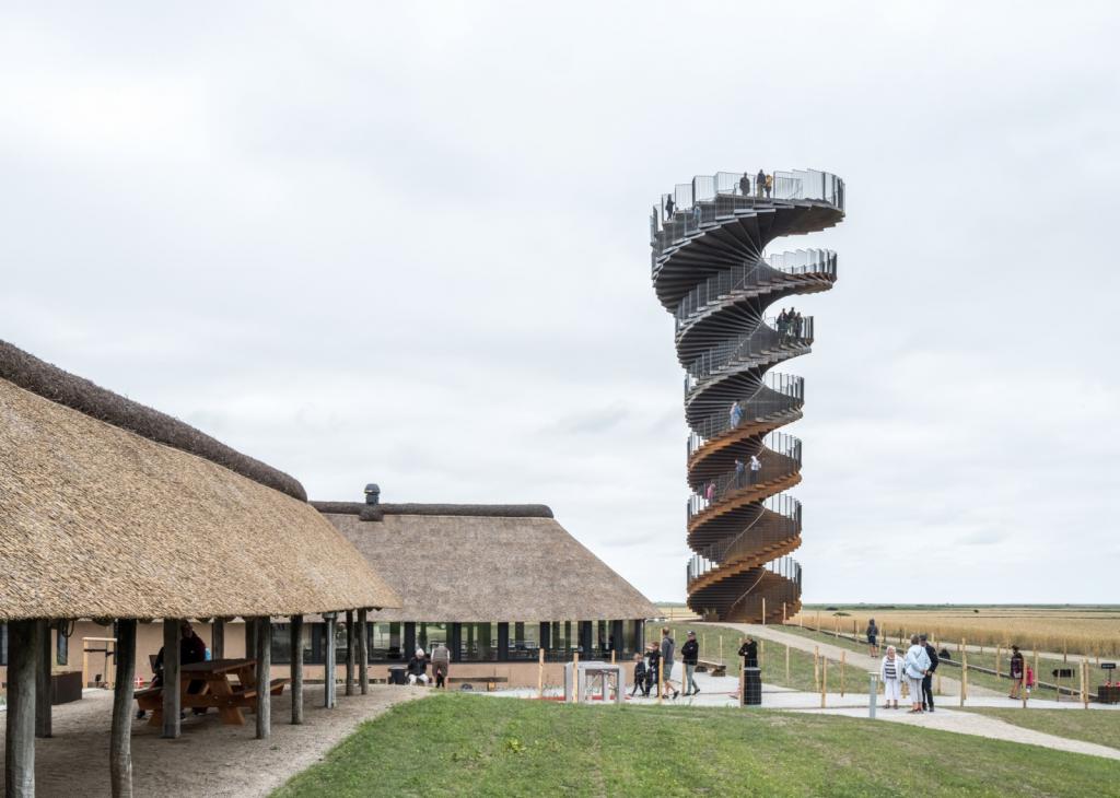 BIG新作马尔斯克塔高25米,它位于丹麦著名的国家公园“瓦登海(Wadden Sea)”的沼泽地边,因此塔楼不仅仅有着广阔的自然视野,同时它的名字“马尔斯克(Marsk)”也来源于其周边的“沼泽”景观。马尔斯克塔作为观景台,它就好像是一个坐落在景观中央的雕塑艺术作品,成为了周边社区之中的关键旅游地标。