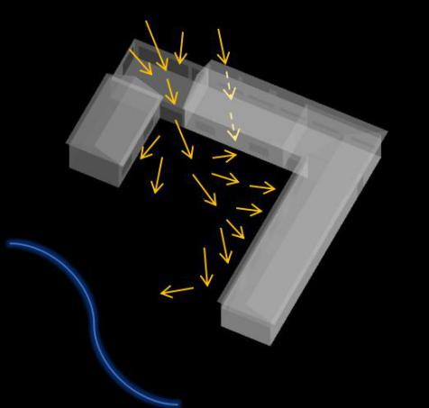“南溪遥”凹形院坝的东北角底层柱廊正对主导风向(北北东),北面加高建筑的坡屋面形成东低西高的顺风趋势,引导自然风同时也穿过屋顶的架空木廊进入院落,吹向西南建筑回旋后从面对南溪的院坝缺口流出。