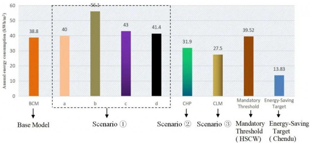 ▲ “南溪遥”在不同围护结构和场景下的年能耗与国标和地方标准的数据对比表