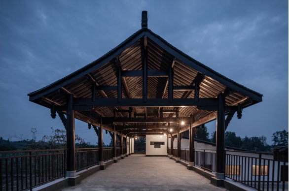 在东面屋顶局部创造性地设置的架空廊桥为百姓增加了不曾有过的登高望山、檐下茶叙的半室内空间体验,通透的屋面通廊特别疏解四川气候的潮湿闷热。