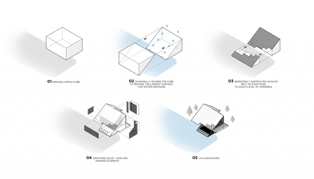 私宅被设定为水处理环节的一部分,并在造型和建造手段上都有着特定的考量。方案源自一个简单的立方体,沿着对角被切成两半,以提供最大的倾斜悬挑屋面用于排水。此外,建筑师还为这栋小房子配备了单户住宅所需的所有功能,将其打造成一个小型且经济适用的实用小宅,并兼顾可持续性。