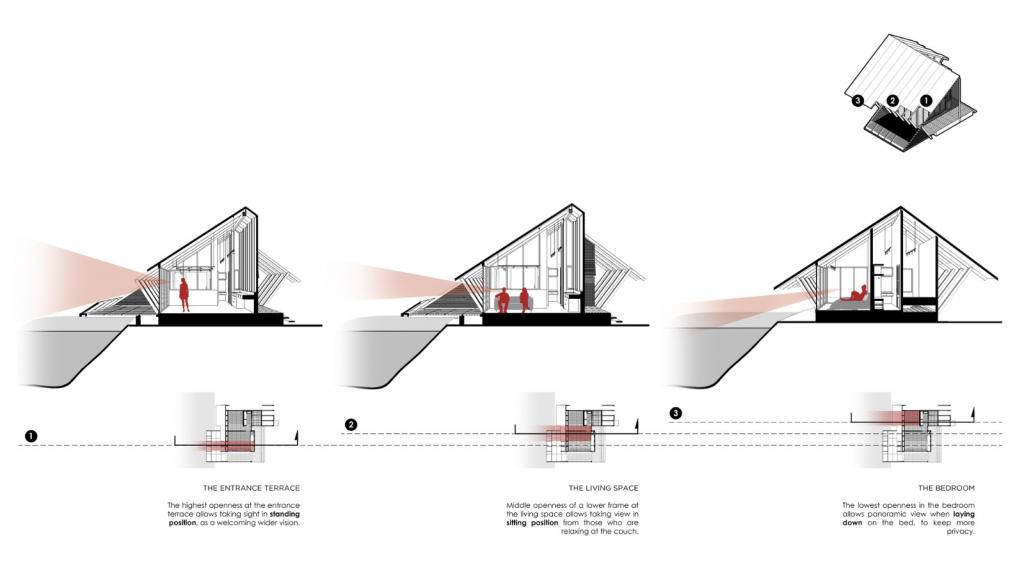 入口平台享有整个私宅最高的开放性,可望见周围的绝佳景致;而起居室和卧室则可以让使用者享有在坐下,甚至平躺时观赏全景视野的可能。