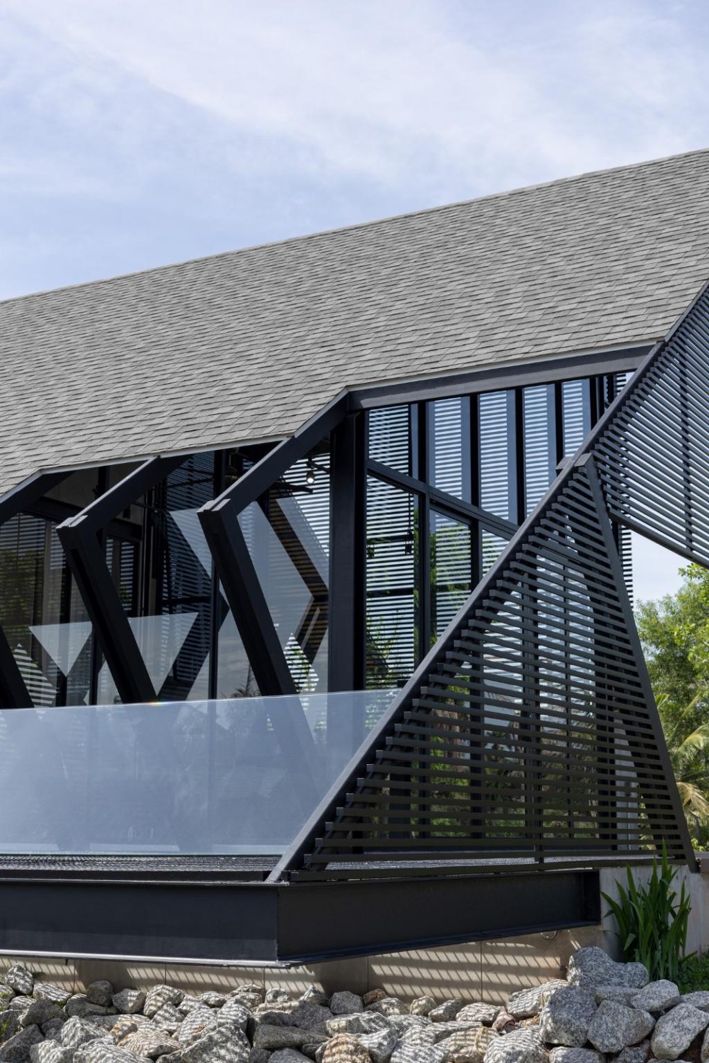 使用耐用铝制格架的墙体是另一处隔热遮阳措施。带有沥青瓦屋顶的钢结构可实现快速简便的安装,并具有轻便耐用的排水功能。 悬臂式户外露台采用钢格板,以让雨水直接落入池塘,并通过水汽蒸发的方式冷却地板上方的空气。此外,铝制格架不仅耐用、维护成本低且使用时间长,其还因采用的夹锁安装方式,可轻松地重新应用于其他建筑物的建造情景。