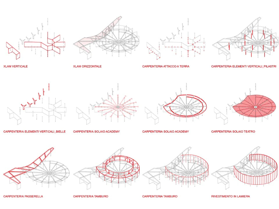 该建筑是一个预制结构,专注于资源的经济性,每个组件,干组装,来自数字生产过程:激光切割金属板和管状型材,数控Xlam面板,纺织建筑。一种模块化系统,设计为在其使用寿命结束时完全拆卸和可回收。