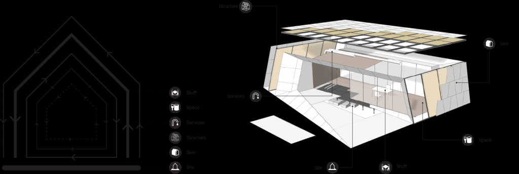 循环实验室的形式是基于堆叠和扭曲框架的概念,其所有零件都是预先制造,运输到现场进行组装。实验室通过外部延伸框架,除展览展示展馆本身的功能外,又是兼具举办活动的公共空间。