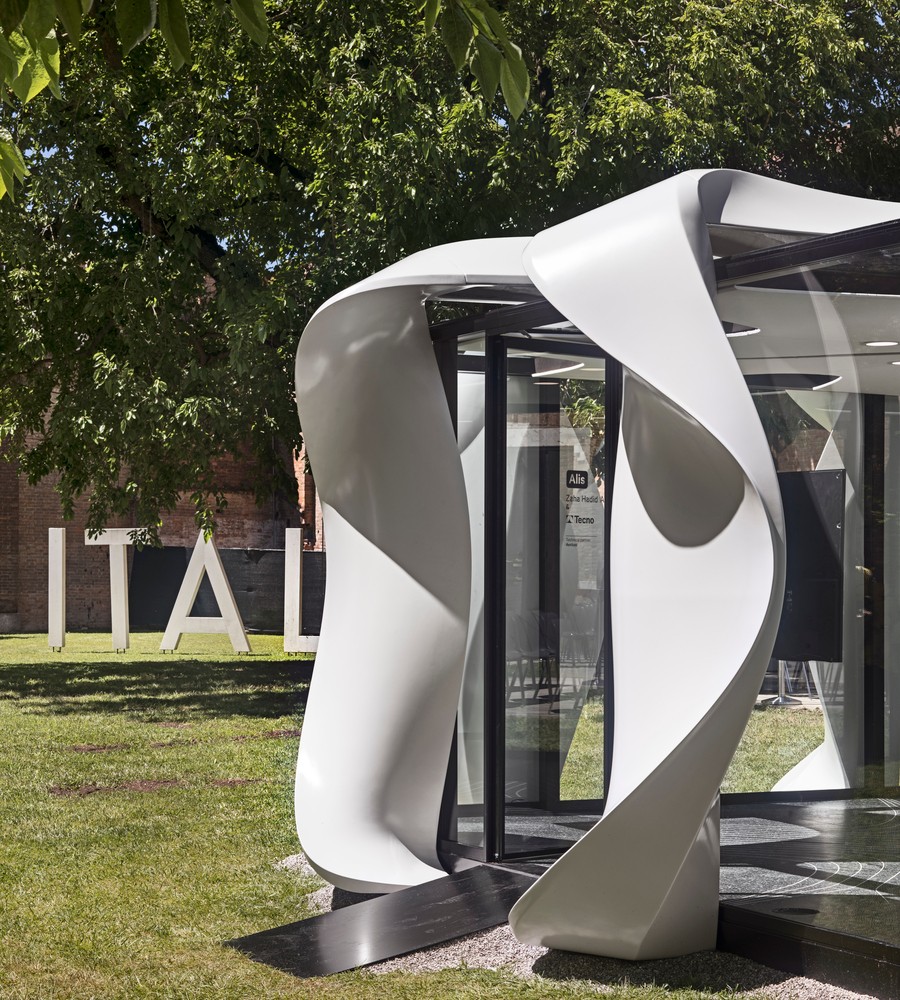 扎哈·哈迪德建筑事务所为2021年威尼斯双年展设计了“高性能城市生态装置”会议舱Alis,结合建筑、工程学、城市主义设计原理,使用了跨学科的综合方式开发了这个可以节约能源和资源的低碳设计。该设计方式重新定义了建筑环境中的能源使用效率,并打造了一个可以改善住所健康环境的模板。