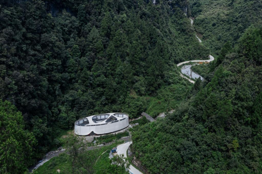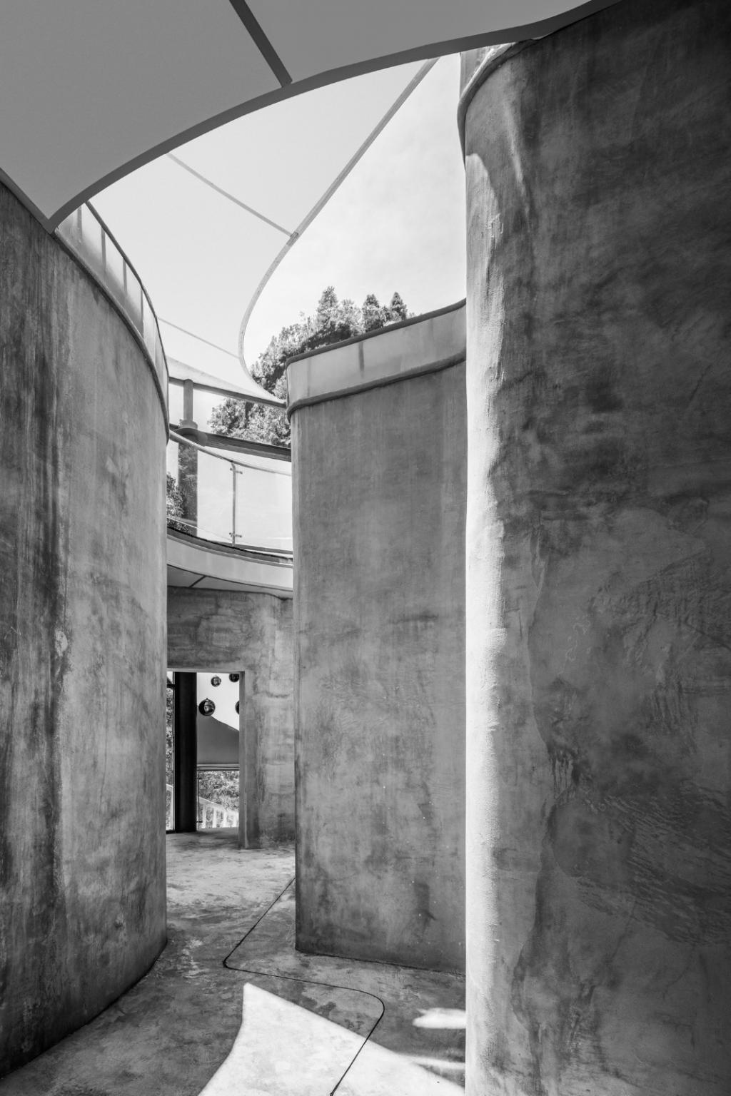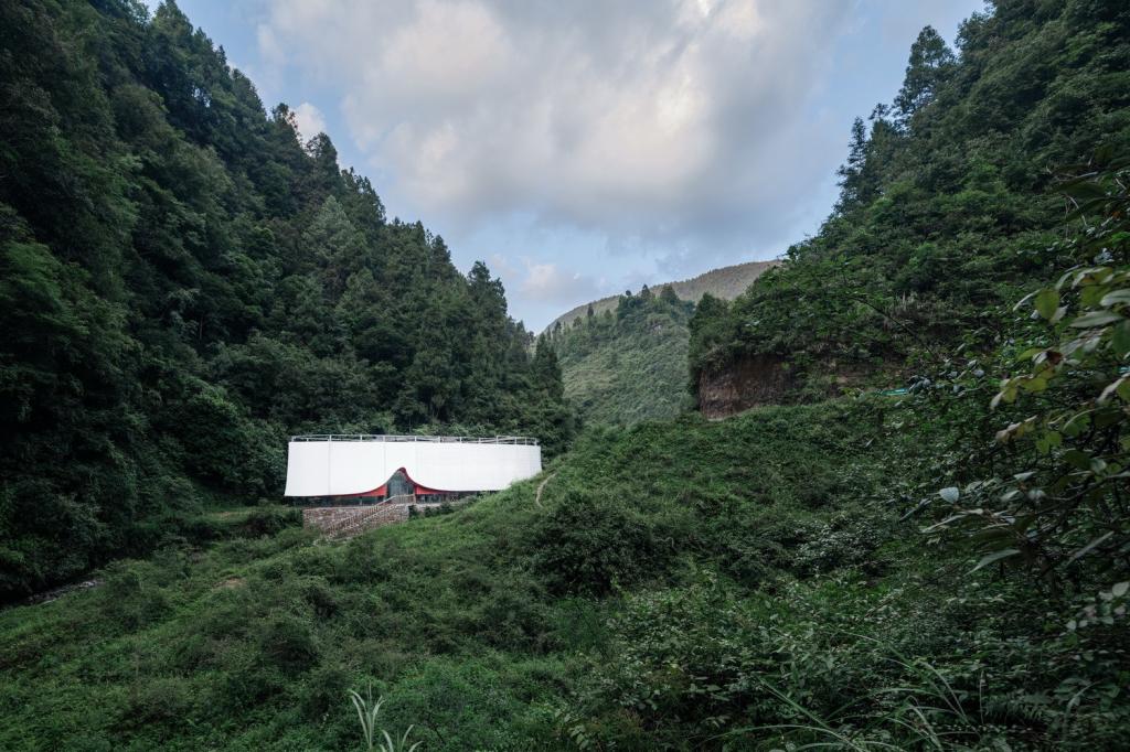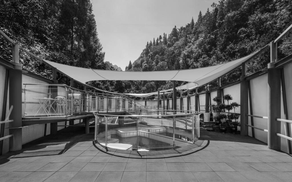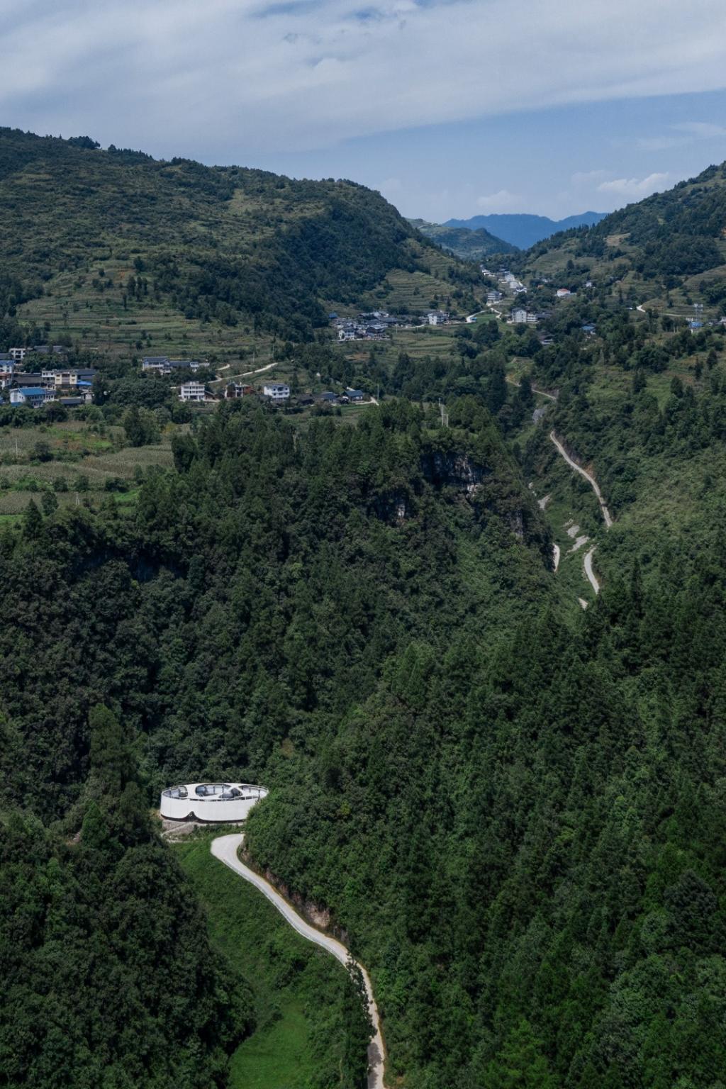向着半透明的白色装置继续前行,沿着最后的水路一直走,便可以发现通往方舟的阶梯。方舟主要功能是厕所和浴室,以及供游客休息的一处平台,底层内部功能组件,形成一座小迷宫,如遗迹一般。由于方舟位于景区深处,到达交通困难,在材料选择上,底层突出一种原始和蛮荒。院里螺旋上升的阶梯,联通到二层平台,与底层材料不同,钢结构组成的构架,支撑起白色半透明织物,如同蚕茧。茧作为一种状态,被我记录下来,保护着自己,也为小十二秘境提供一个安全场所。在茧的包围之中,穿过交错的“蚕丝”登上屋顶,仰视群山,内心平静。