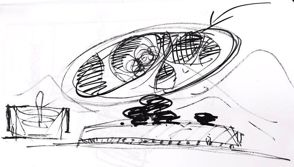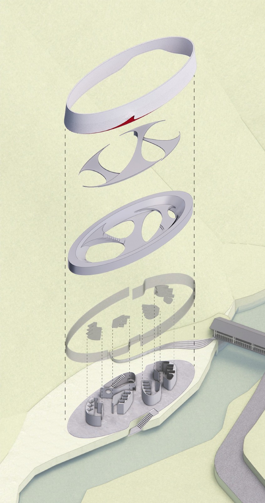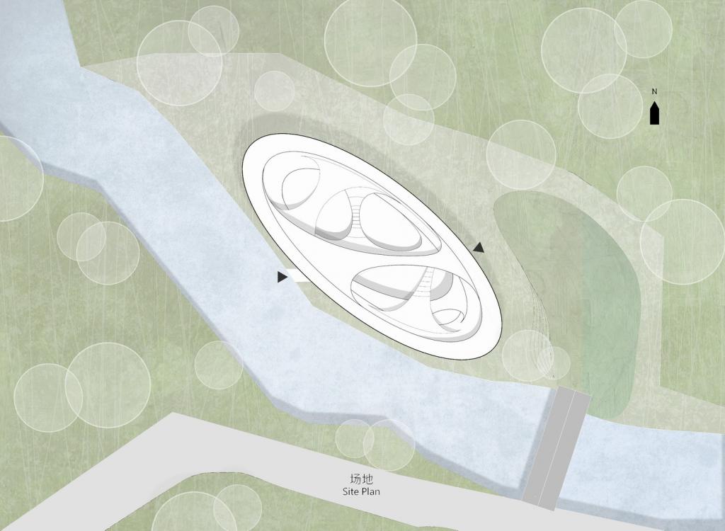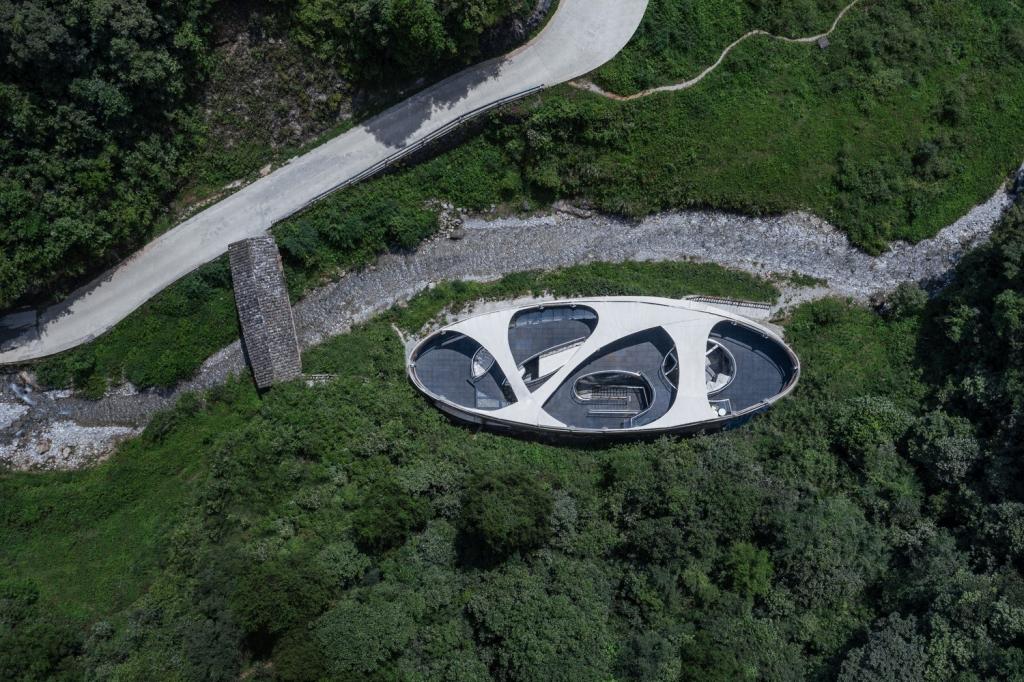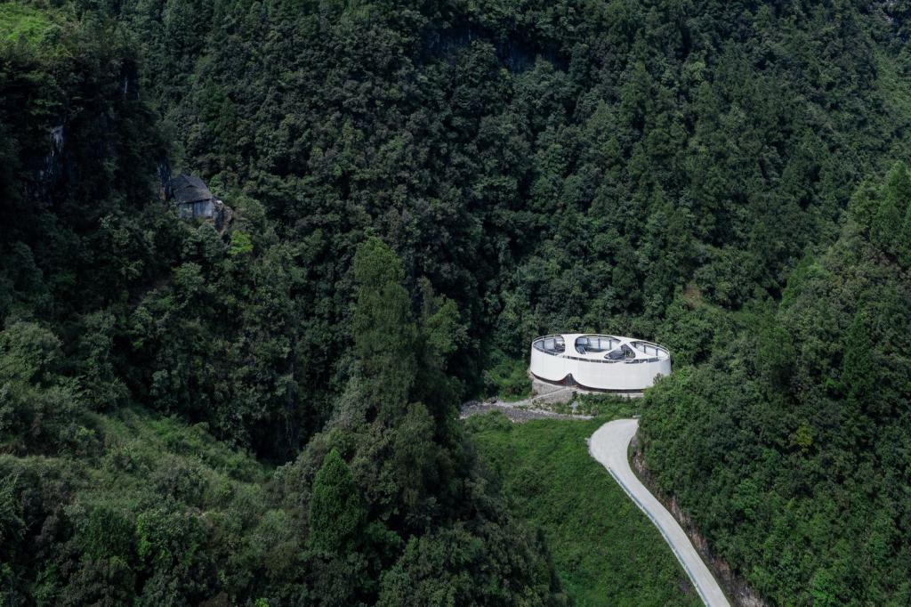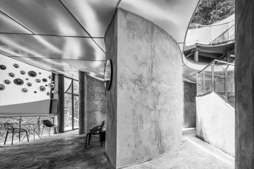 向着半透明的白色装置继续前行,沿着最后的水路一直走,便可以发现通往方舟的阶梯。方舟主要功能是厕所和浴室,以及供游客休息的一处平台,底层内部功能组件,形成一座小迷宫,如遗迹一般。由于方舟位于景区深处,到达交通困难,在材料选择上,底层突出一种原始和蛮荒。院里螺旋上升的阶梯,联通到二层平台,与底层材料不同,钢结构组成的构架,支撑起白色半透明织物,如同蚕茧。茧作为一种状态,被我记录下来,保护着自己,也为小十二秘境提供一个安全场所。在茧的包围之中,穿过交错的“蚕丝”登上屋顶,仰视群山,内心平静。