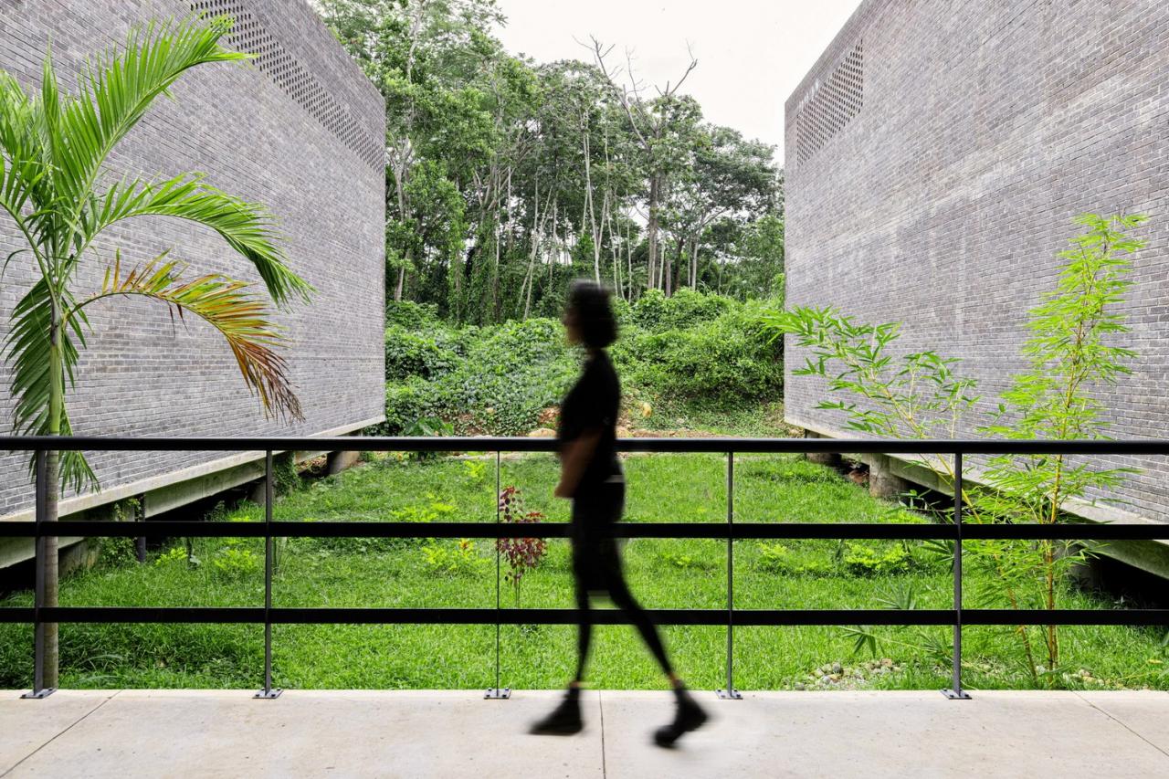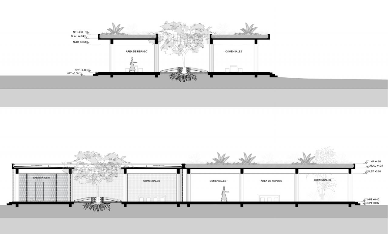 社会援助中心的主入口位于Avenida 8va Norte大道前。室外的广场空间可从庭院出入,一旁的台阶则通向“社会支持”建造模块的露台区域,可为用户提供舒适的环境以及举办室外文化活动的场所。除“社会支持”建造模块外的其他模块,都位于较低的北侧露台,借助支架与出入口相通。这一做法可促进雨水的自然渗透,并利用地面为北侧露台提供遮蔽,免受日晒雨淋。连接建造模块和入口的抬升式中央走道,可提供远眺和观测周围自然环境的绝佳站位。