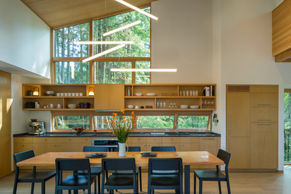 道格拉斯冷杉橱柜和复合木地板色调朴素,有助于联系家庭的背景。中性色调与流行的色彩搭配,比如毛绒绒的红色沙发。餐桌是当地一位工匠用打捞上来的旧原木做的。建筑师在这个项目中融入了许多可持续发展的元素,包括一个9.3千瓦的太阳能电池阵列和备用电池,使房子的电网电量为零。这个休养性建筑还有低流量装置,高效率的电器,空气源热泵与地板内循环回路。整个建筑都采用了LED照明。
