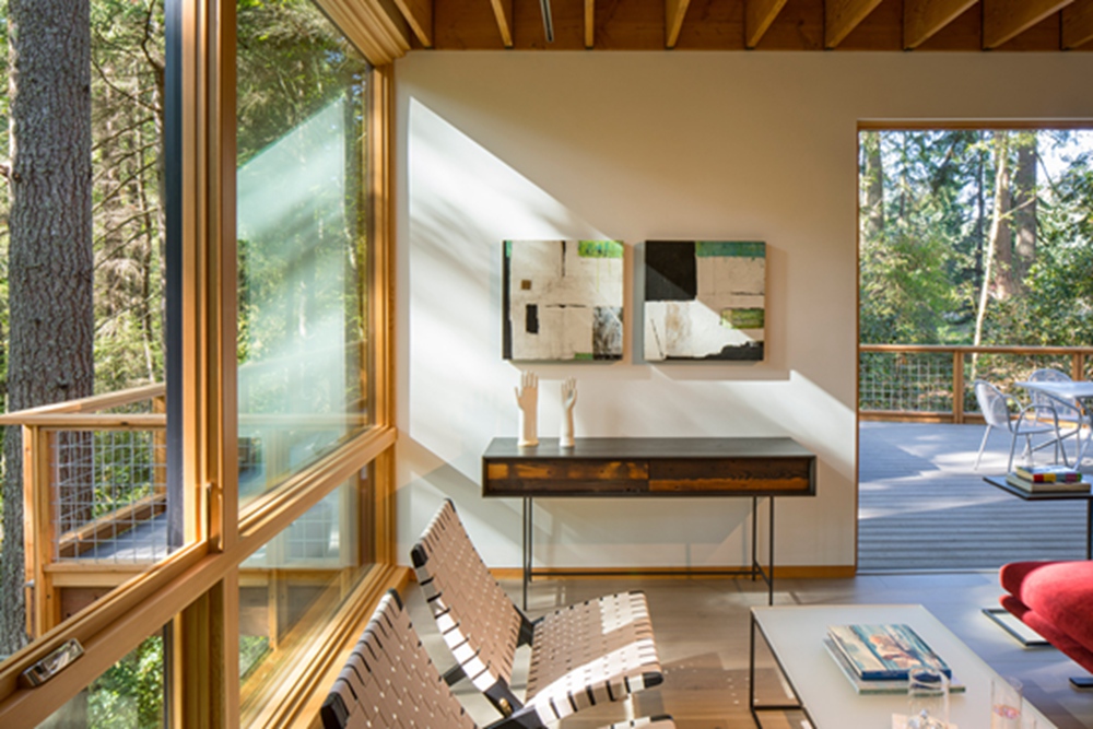 建筑师大卫-范盖伦为他和他的妻子设计了这个隐居地,他们几十年来一直在这个森林密布的岛屿上游览。几年前,他们开始在那里寻找房产,最后购买了一块5英亩的土地,上面种满了桤木和道格拉斯冷杉。范盖伦随后着手打造一个舒适的家,充分利用其宁静的环境。