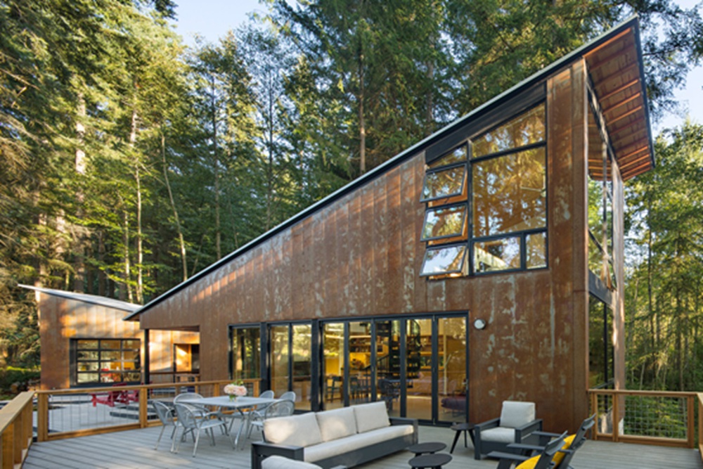 美国建筑师大卫-范盖伦(David Van Galen)为自己和妻子设计的两幢覆盖考顿钢(Corten Steel,,注:一种耐候钢)的斜屋顶住宅,构成了美国西北部太平洋沿岸的一个自然休养地。