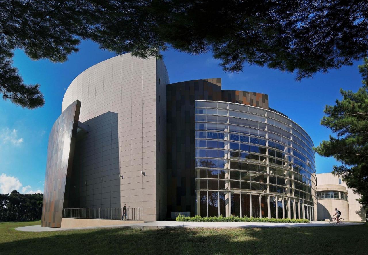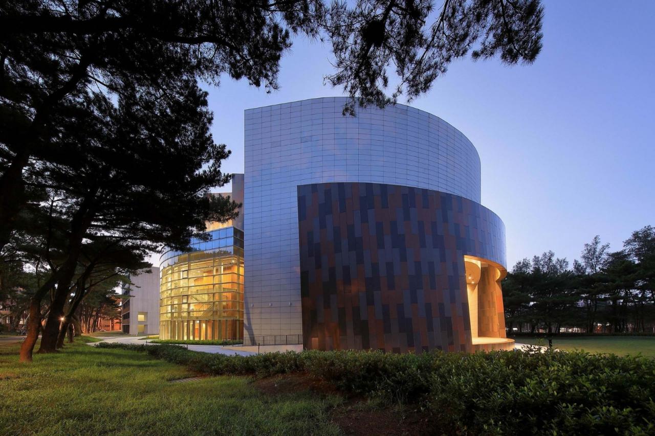 大礼堂位于校园核心中轴在线,坐拥生气盎然的松林,设计概念即取其松果意象,运用在循序渐进的空间层次及浑圆雍容的内涵表达,甚至是织形错落的声学反射;提供不同形式之音乐表演、剧场、集会演讲及户外演出场等活动使用;