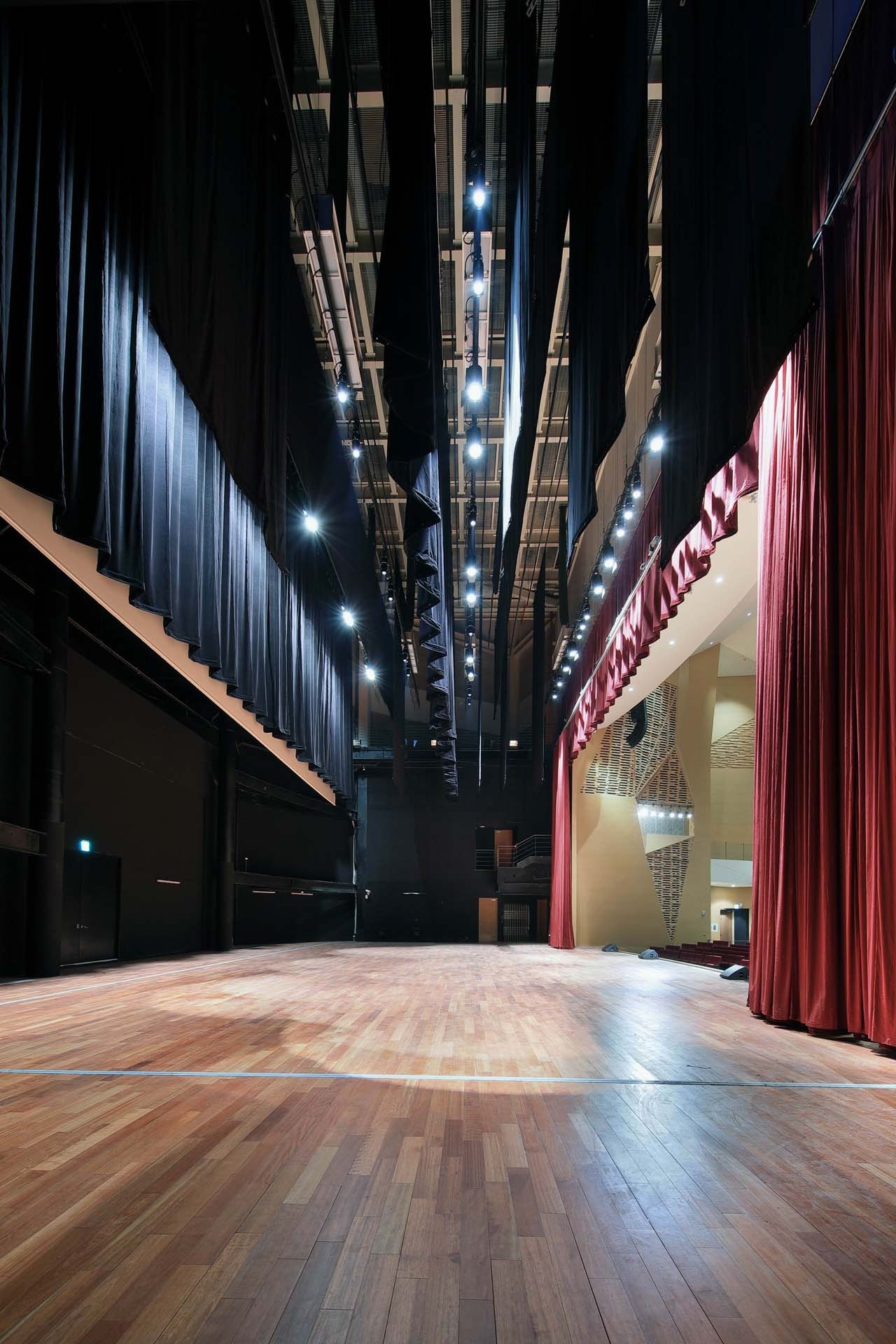 舞台可容纳近百人大型乐团演出,进行演奏或演唱时,舞台反射罩除供扩音之用,也有助提升表演团体各声部的融合度;舞台可转作户外演出表演后台,观众于倾斜草坡席地而坐聆赏表演。礼堂功能切换演讲或集会模式时,讲台背投影设置可避免听众席视线眩光。