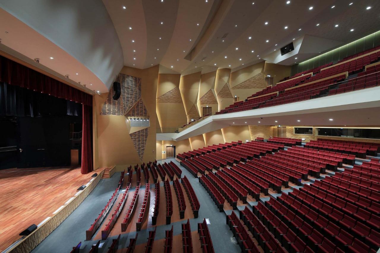 容纳一千六百人的大礼堂,透过入口广场、门厅、艺廊、空中通廊、室内/户外观众席等的空间串联,不仅为校内提供充足的学术研讨活动空间,符合国际标准兼具会议及专业展演功能的场馆,更肩负了开拓大桃园地区市民文化视野的重任。