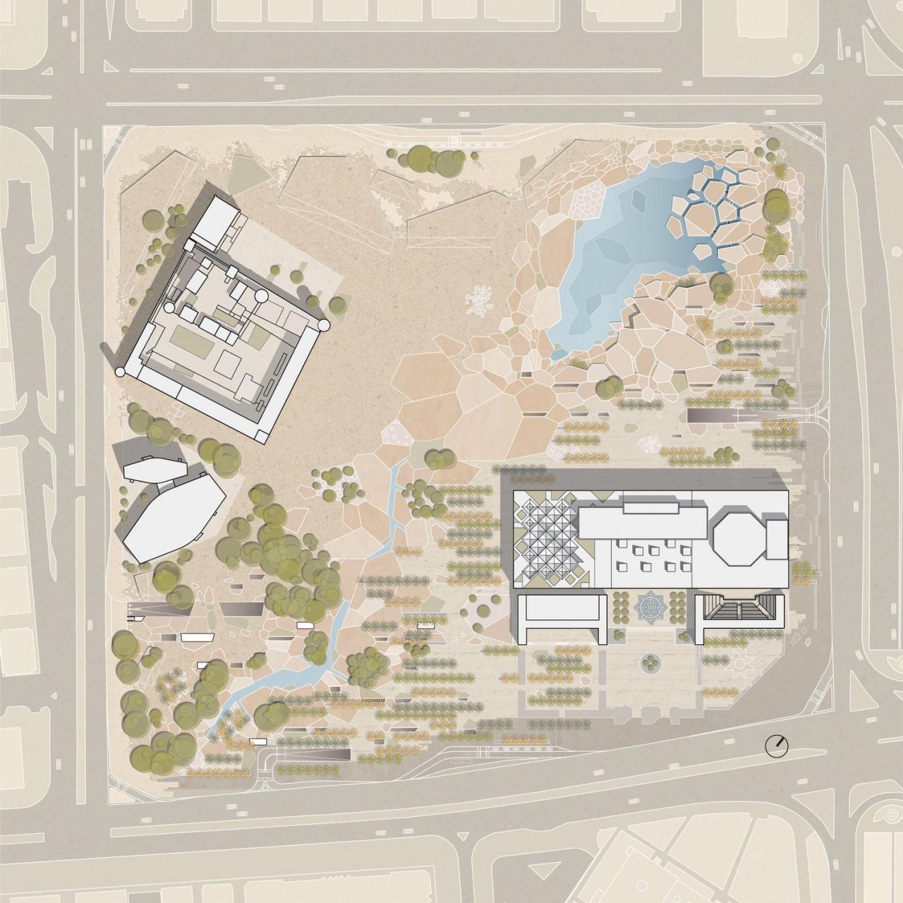 恢复沿海沙漠景观总体规划通过将场地沿对角线划分为两个对比鲜明的景观来强调这种双重性。一方面,堡垒周围的平原,柔软和开放的沙漠景观将建筑塑造成独立的地标,就像现代城市迅速崛起之前一样。另一方面,在文化基金会的周围进行了铺装和功能规划,将沙漠景观与现代城市网格结构相结合。