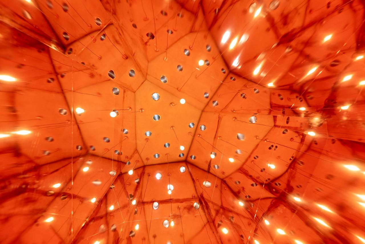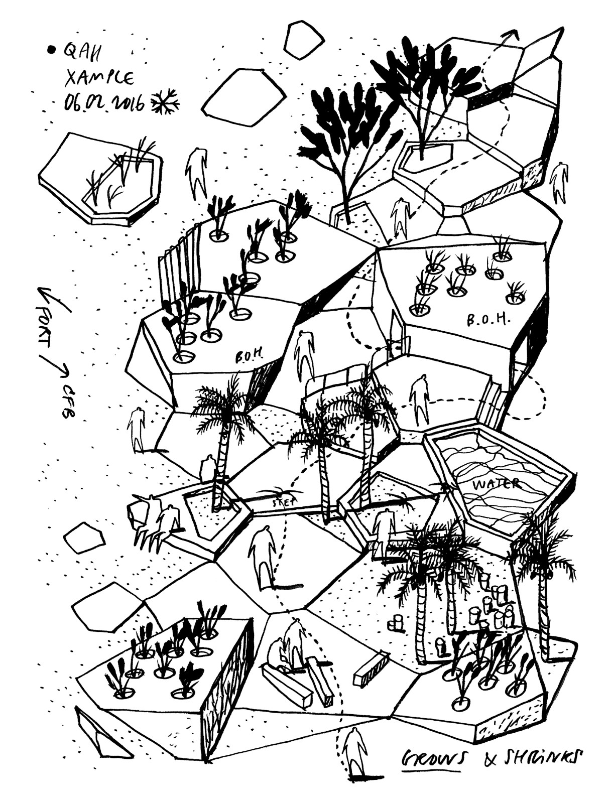 景观和建筑物的几何形状在室内被镜像为具有相同泥浆裂缝模式的悬浮景观,其功能像天窗一样,带有小圆形开口,打通了其他封闭体量的天花板。圆形的洞引入阳光,并与悬挂的吊坠组合在一起。它们作为抽象的恒星形态共同出现,唤起人们信仰以及对贝多因人传统的凝视导航星的联想。入口大厅和沐浴空间采用混凝土天窗,礼拜堂的内部复盖着铜,创造出无尽的光反射,象征着宇宙,并将天花板的细节像分形一样连接到项目的整体方案中。与此同时,它也说明了人类是如何仰望天空,思考自己的存在。