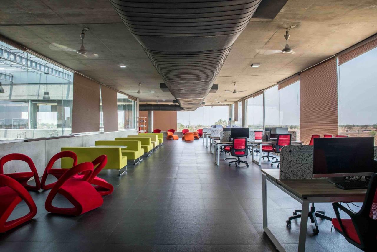 一条侧边有贮水池及修剪整齐的草坪,长而笔直的道路通向这座建筑物,给人以一种欢迎之感,同时也为裸露的水泥和玻璃组成的立面创造了一个柔和的前景。明亮的家具使室内空间变得饶有趣味却又不失庄重。裸露的供热通风与空气调节(HVAC)管道充实了该设计忠于结构与功能的目的。