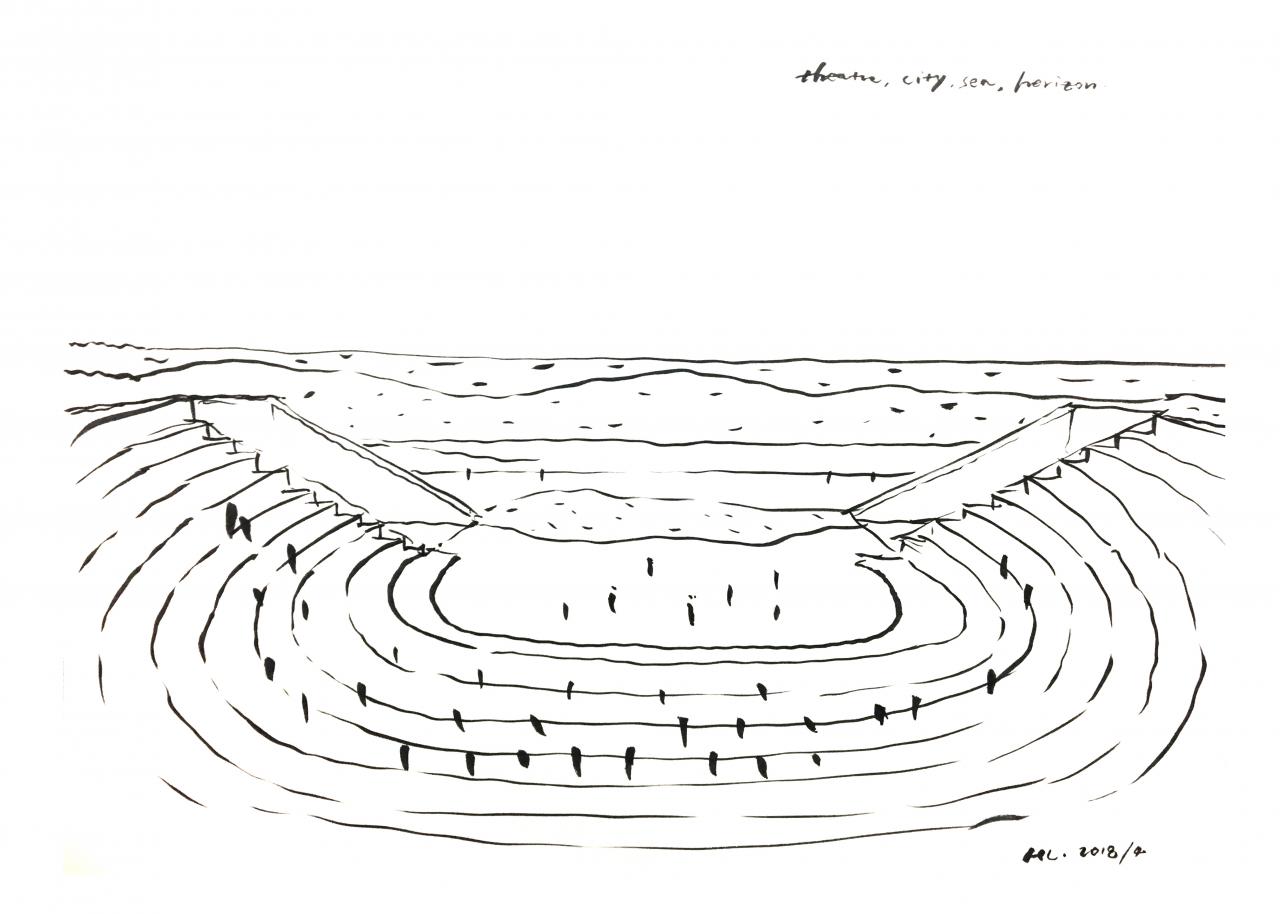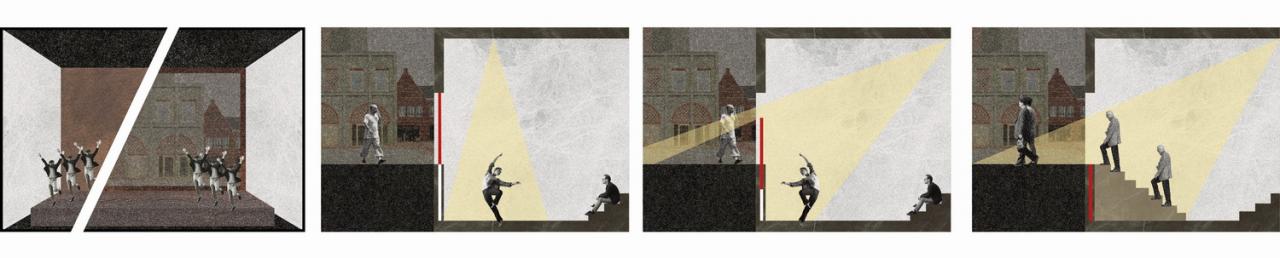 剧场建筑的本质即是处理观与演的关系。传统的剧场是一种封闭式的盒子空间,演出都发生在内部。设计最初的想法是将剧场打开,让舞台以海、城市为背景。舞台布景与真实的小镇城市生活场景产生并置,以创造特有的属于海边的剧场。因此,在设计起始时,蜂巢剧场的舞台后面设计了一个可以完全打开的门,演员从街道进入舞台,城市的街道成为舞台空间的延伸,产生一种沉浸式戏剧体验。可惜这样的设计需要与剧目本身的设计高度结合,最终考虑到剧目的不确定性,没有实施这一想法。