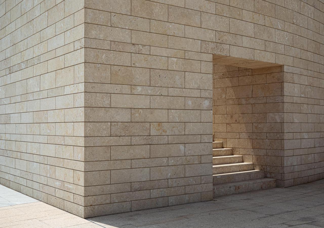 酒神剧场采用一种来自海底的珊瑚石,保留石材切割后原始的化石孔隙,塑造其作为城市公共空间的纪念性,以及暗示与海的关联性。A剧场外立面石材颜色较浅,石块的分割遵循人眼近大远小的透视规则,呈现疏密有致的韵律。