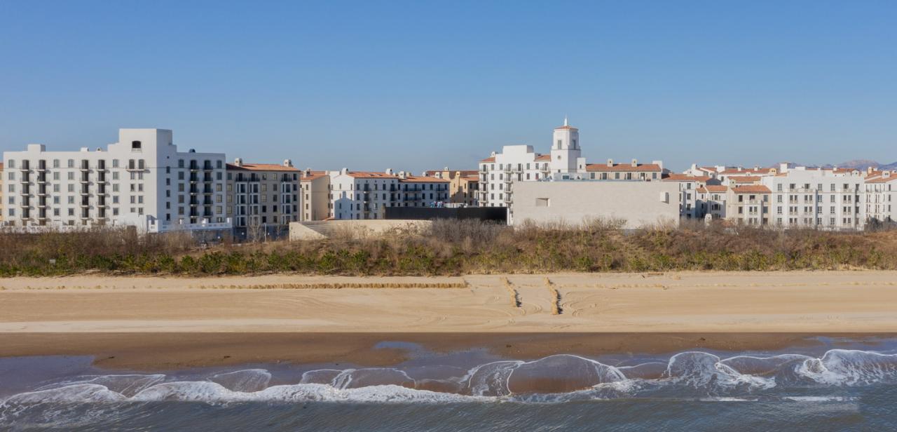 阿那亚剧场坐落于河北秦皇岛的黄金海岸,是阿那亚小镇六期建设的中心。项目位于两条主要道路交汇处的一块异形场地,场地一边与海隔沙丘而望,另外三面都是紧邻公寓建筑的城市环境。因此,如何处理剧场与大海、街区、周边建筑的关系以及如何塑造城市空间成为设计的重点。
