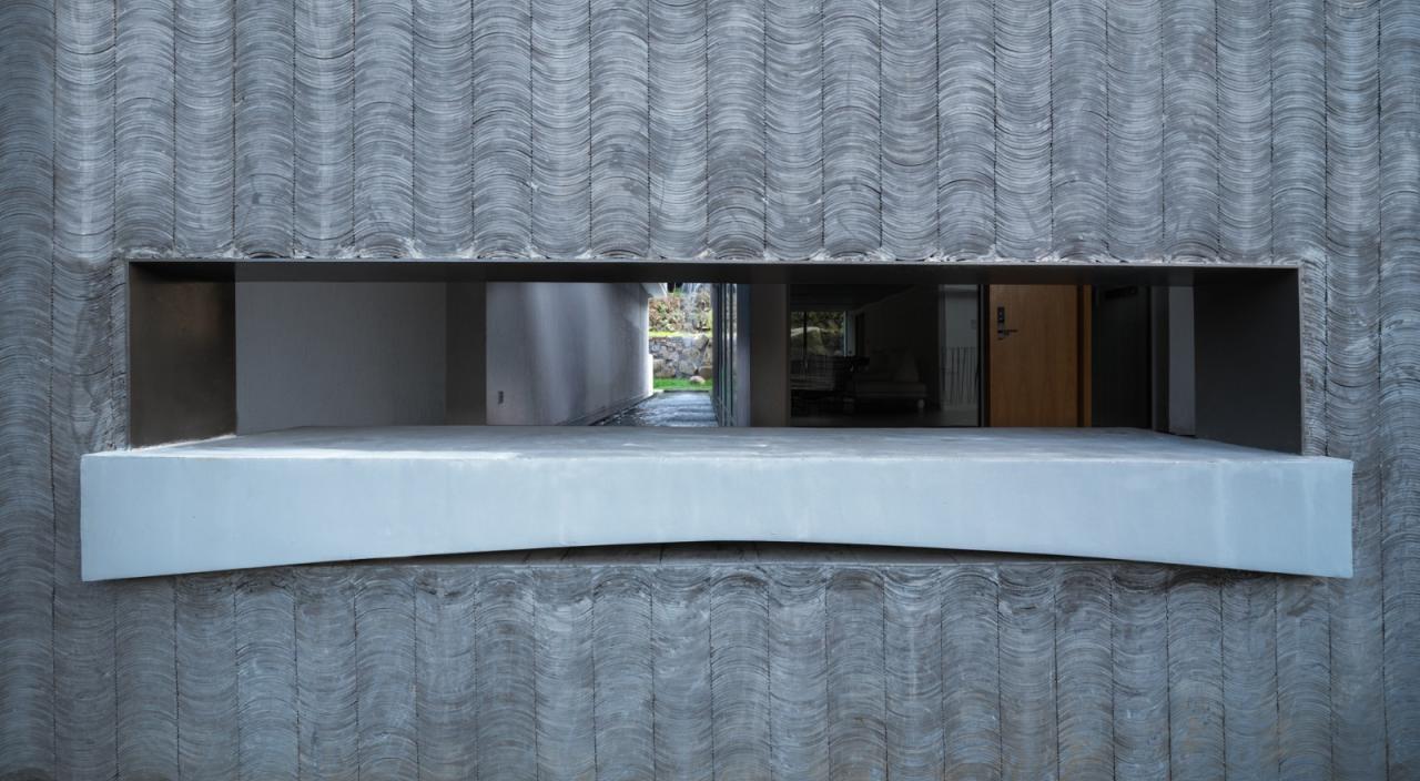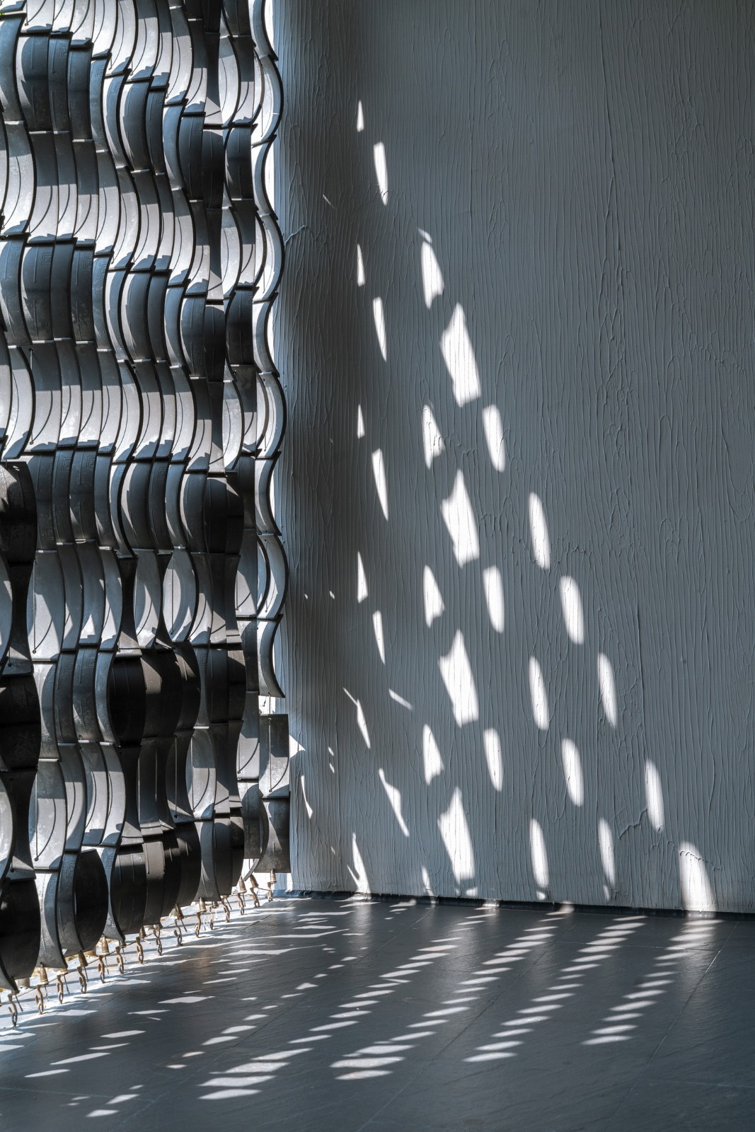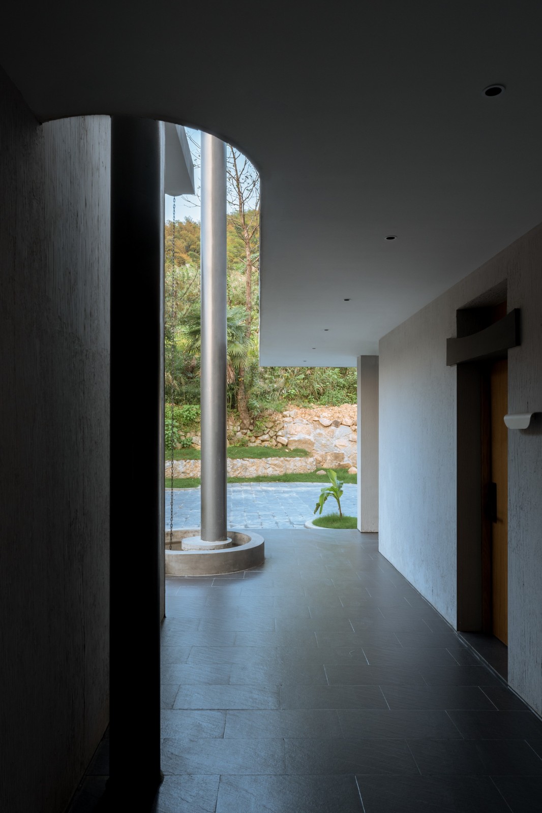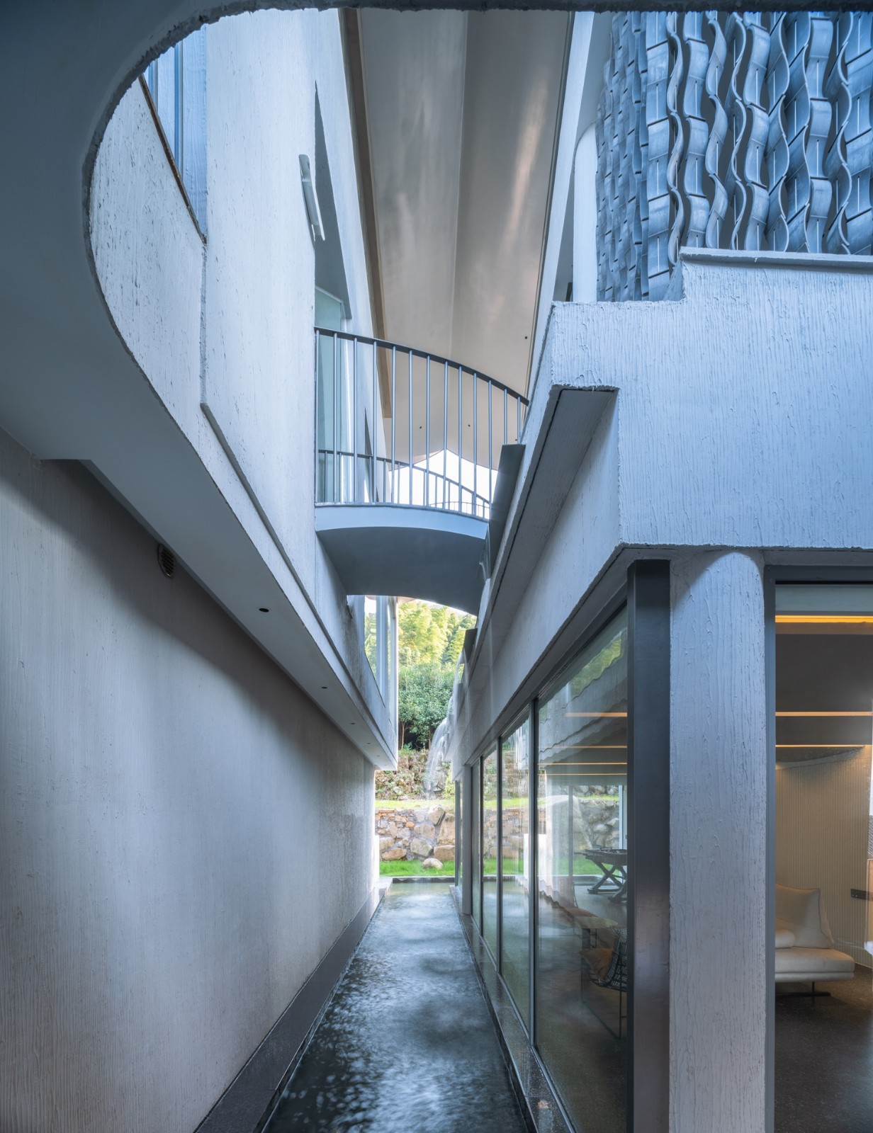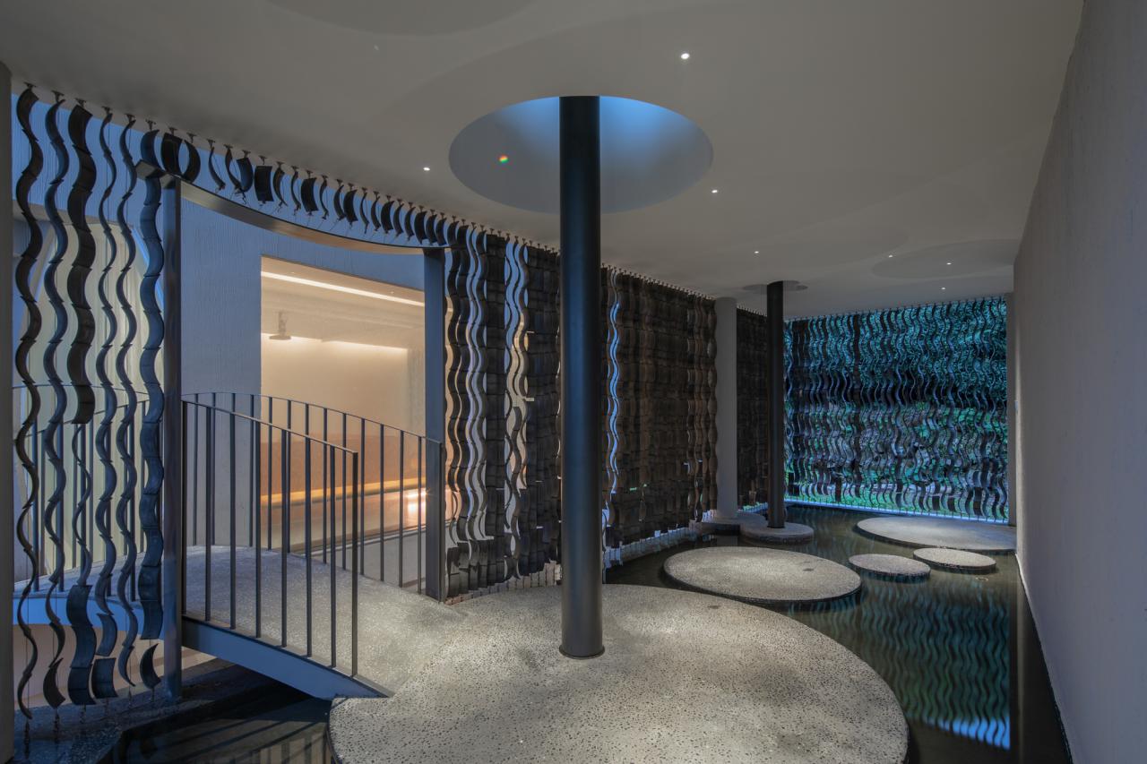 2、川水水路沿竖直方向奔涌而下,形成最有力量的疏导。“水滴石穿”是描述水力的古老形象。而在设计中则是让水路向下洞穿混凝土板,让水之力得以显形。