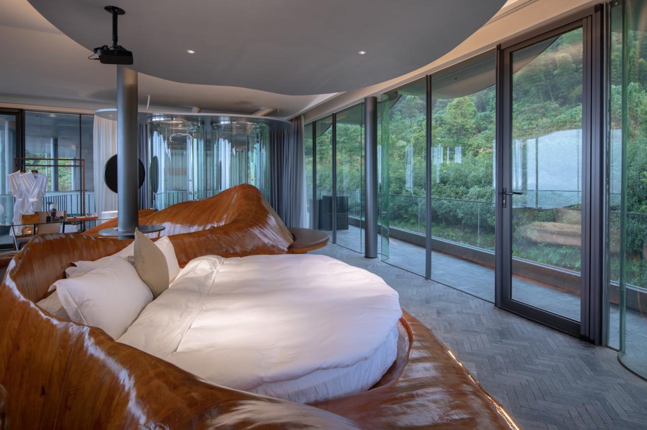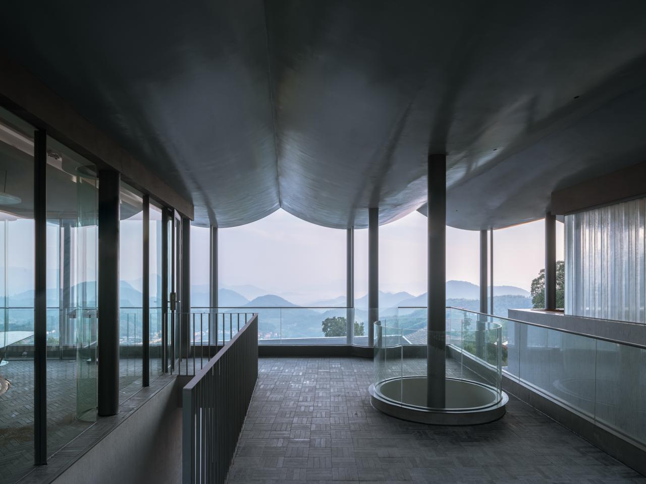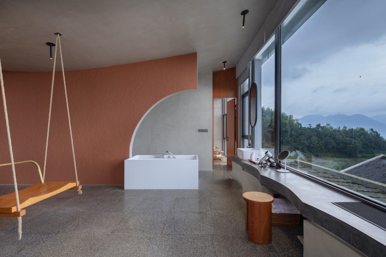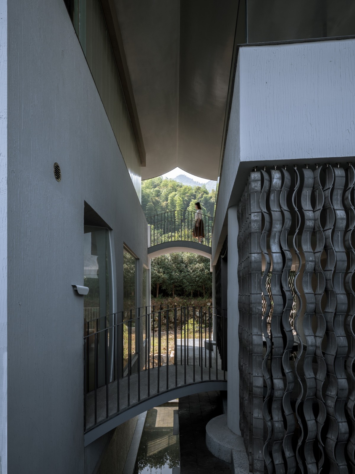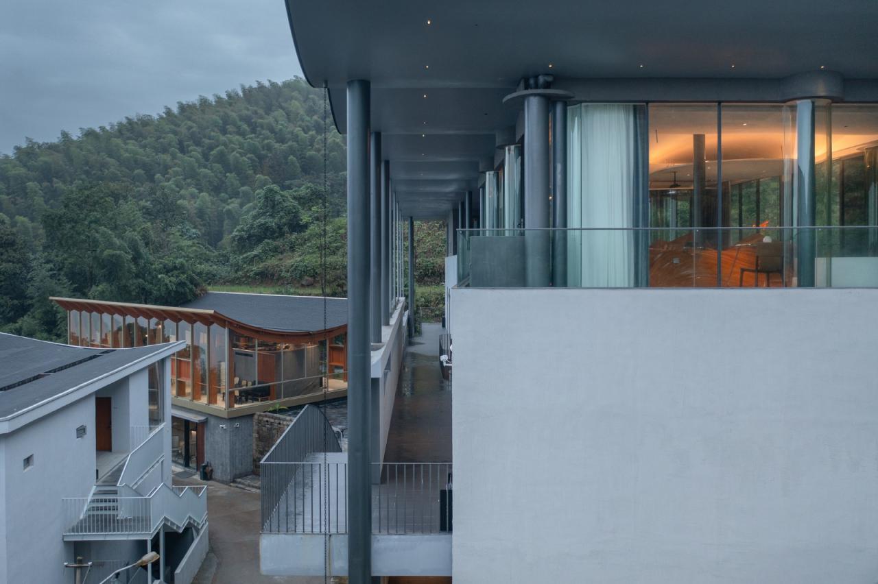 6、跨水桥是富有诗意的人造物,连接和跨越:越涧,越塘,越层,是空间之间,身体层面的线性连接。在雨屋的顶层,有一间四面通透的大山亭,在屋中,将远山和身体连结。在檐下,于心中,留一片山水。