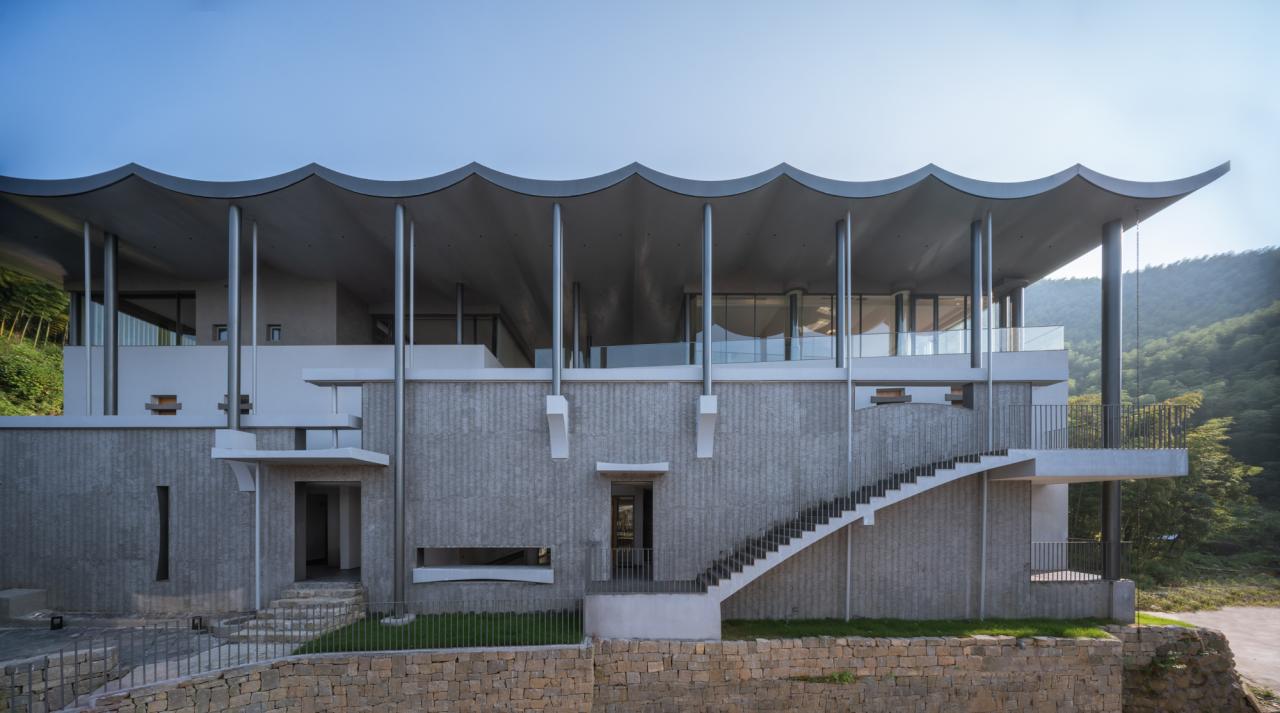 1、举水将屋顶高高举起,或从地面挺立或从墙边承托,水波形连续的屋顶是导水的容器,将原本均匀落下的雨滴汇聚成线性的水路。