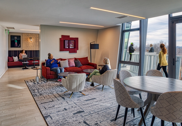 从这个城市拱门(Gateway Arch)向东看去,每套公寓都有一个有角度的客厅,有两扇暴露的窗户,室内光线充足。塔楼的底层包括公共空间和零售空间。