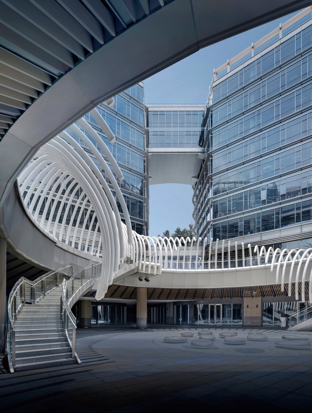 形体以“中通外直,不蔓不枝,香远益清,亭亭静植”为立意,采用5个花瓣向上层层绽放的形态,横向的浅香槟色铝板既满足遮阳要求,又形成立面上统一的基调,追逐着阳光,洒下不同时段的阴影,增强建筑的体量感;沿着曲线无限延伸的玻璃幕墙和小尺度的办公进深相得益彰,最大程度地将自然光引入室内深处,为员工提供一个自然舒缓放松的办公空间。 竖向的金属圆管,轻盈的穿插在横向铝板之间,在阳光的照射下,宛如清晨点缀在花瓣上莹润的露珠,灼灼其华,温婉动人。