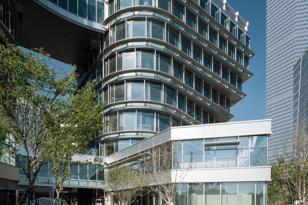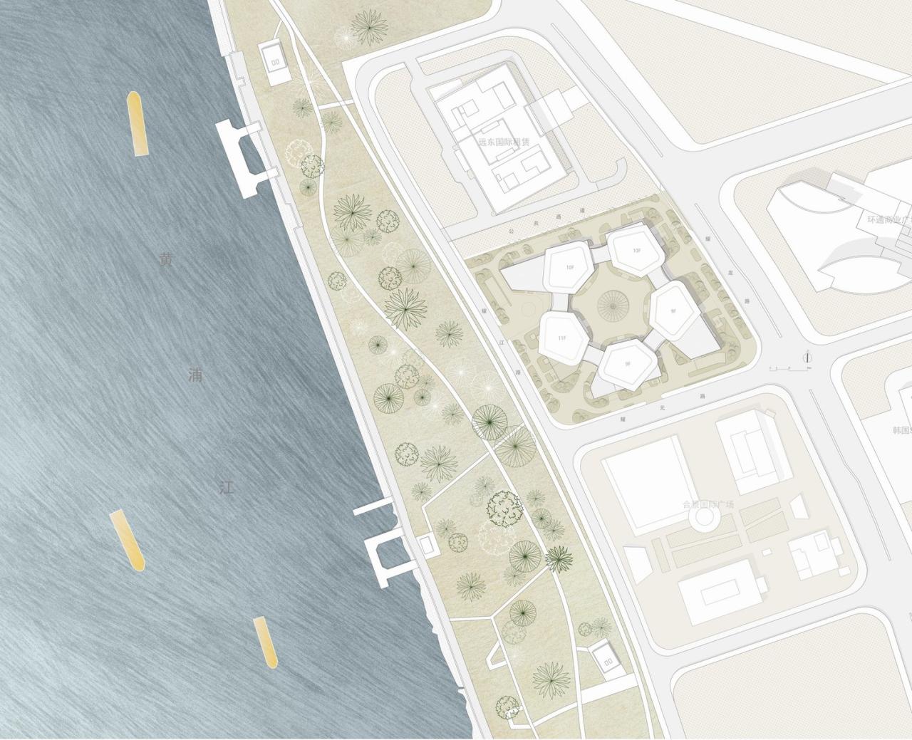 该项目作为后滩板块的滨江展示第一界面,以较小的体量和精巧的造型介入城市和自然汇聚之处,海上之花徐徐绽放,期许未来成为区域的商业引擎和脉搏核心包容欢迎城市人流。它既是浦东天际线的落点,以较为活泼的姿态、亲切宜人的尺度和舒展开放的底层城市花园区别于周围大楼单一的排列布局方式,谦逊地融入周边特别是滨江沿岸绿地和水面;也是黄浦江横向界面天际线的跃起点,从徐汇滨江文化艺术项目到高层商务建筑平缓过渡,消减了城市上空的高密度,化坚硬的天际线为柔和的曲线。