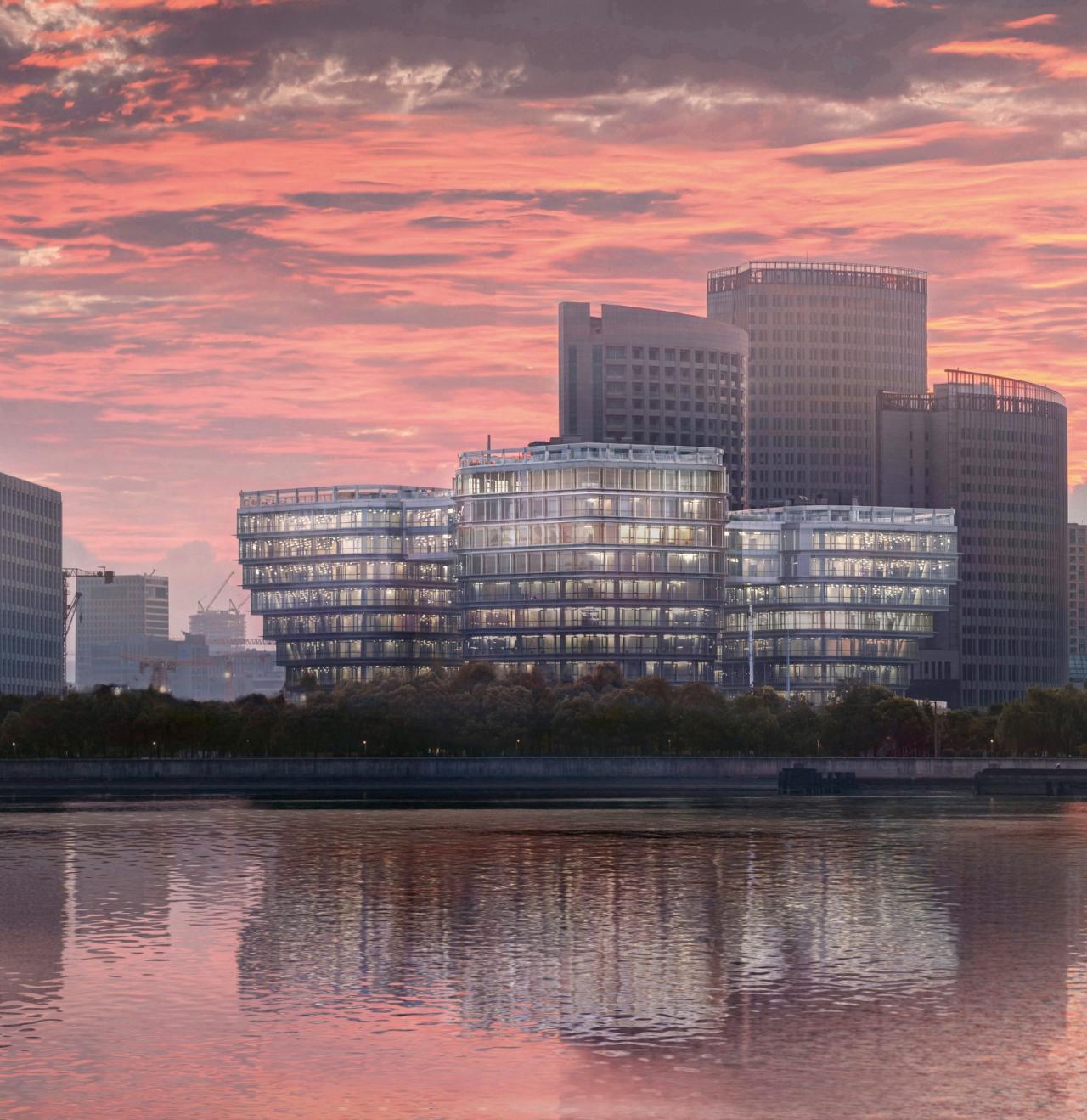 莲花造型的建筑一蕊五向开,层层出挑的楼板勾勒出别具一格如花瓣般的优美轮廓,在提高建筑利用率的同时,使每栋楼宇的客户均够享受到360°一线江景资源,将建筑打造成横跨浦江两岸连接徐汇艺术聚落和浦东商业中心的视线通廊。