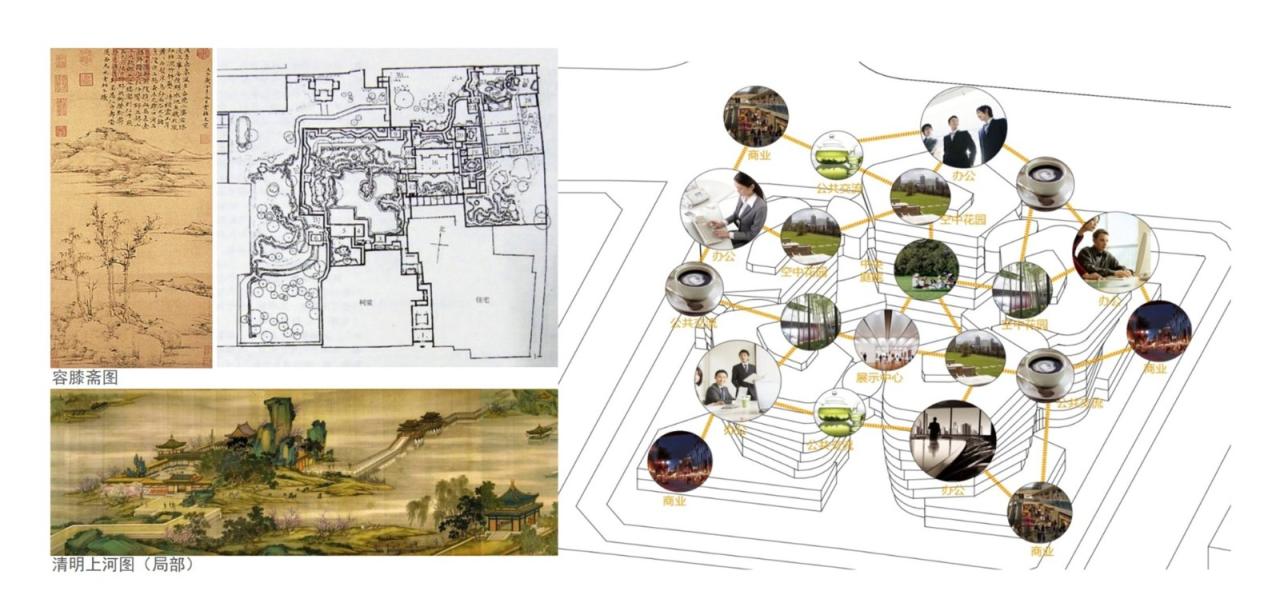 在遵循城市原有肌理的前提下,建筑的下半部分倡导一种高密度小街区的城市生活模式,将割裂的城市交通融合,提高城市步行友好性:一方面建筑向北侧街道敞开通道与周围建筑同塑公共绿地,延续滨江绿地线,另一方面打通与周围地块的地下联系,使商业、交通、车库的共享成为可能。同时在地面设置滨水岸线的步行入口,将沿江绿化带的人流直接引入到基地内部,再向商务区的四面八方辐射出去,使滨江绿地自由地向城市街区敞开。