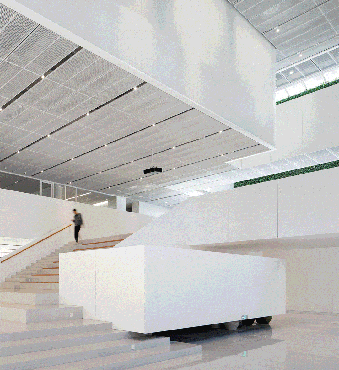 通过一条路径,穿越水景前场进入建筑内部,钢结构的结构形式让装配式的建筑空间塑造更加灵活和放松,整体空间由三层通高的交流大堂串联起来。人们或于主厅大台阶上与人沟通交流,或在UAD Cafe小憩,或漫步于侧厅观看定时更新的建筑展览,或驻足于装配式垂直绿化中庭前通过光伏玻璃望向天空,这样一组围绕人的动线展开的室内公共开放空间充满了流动感,空间界面彼此消融。