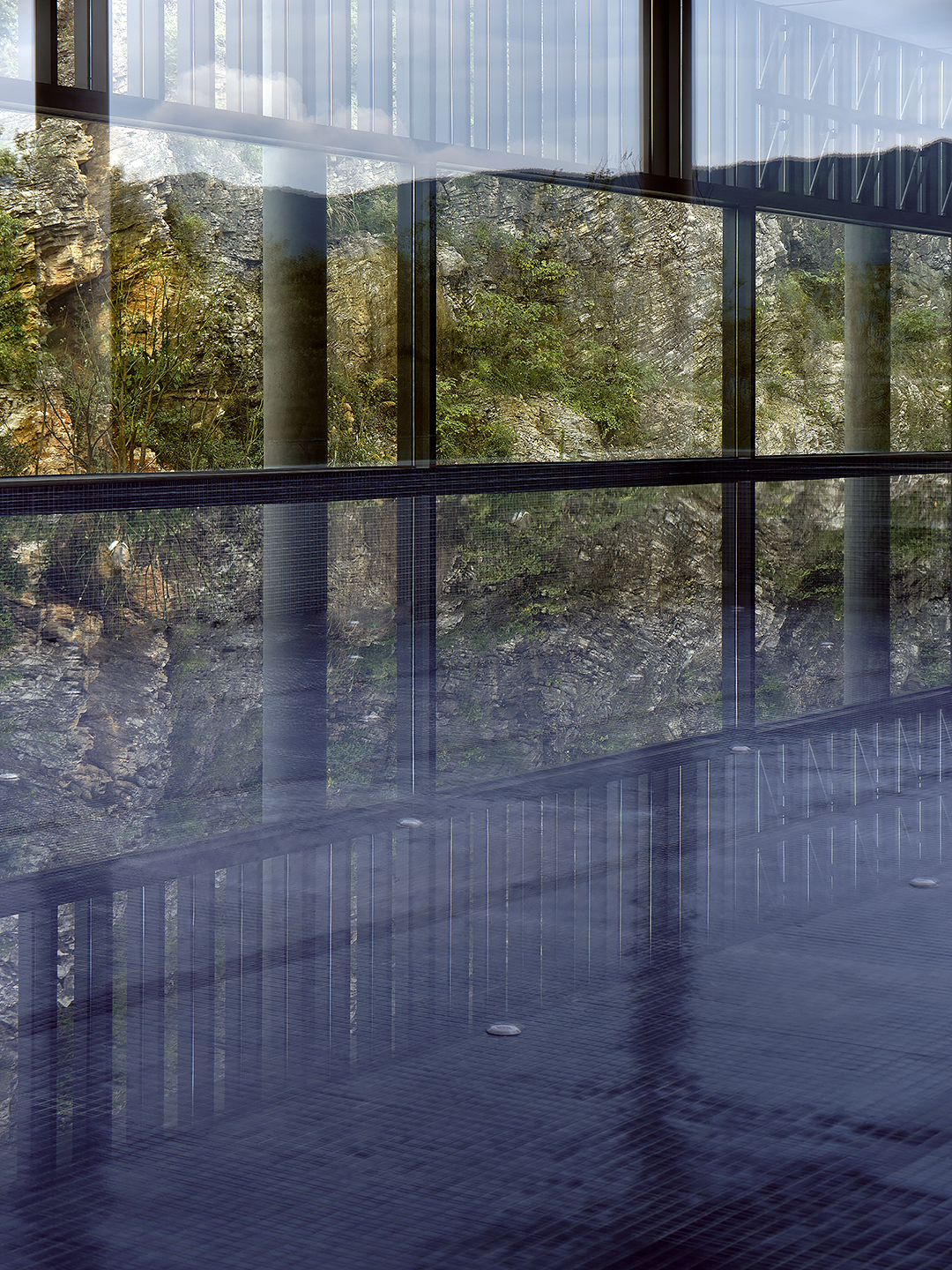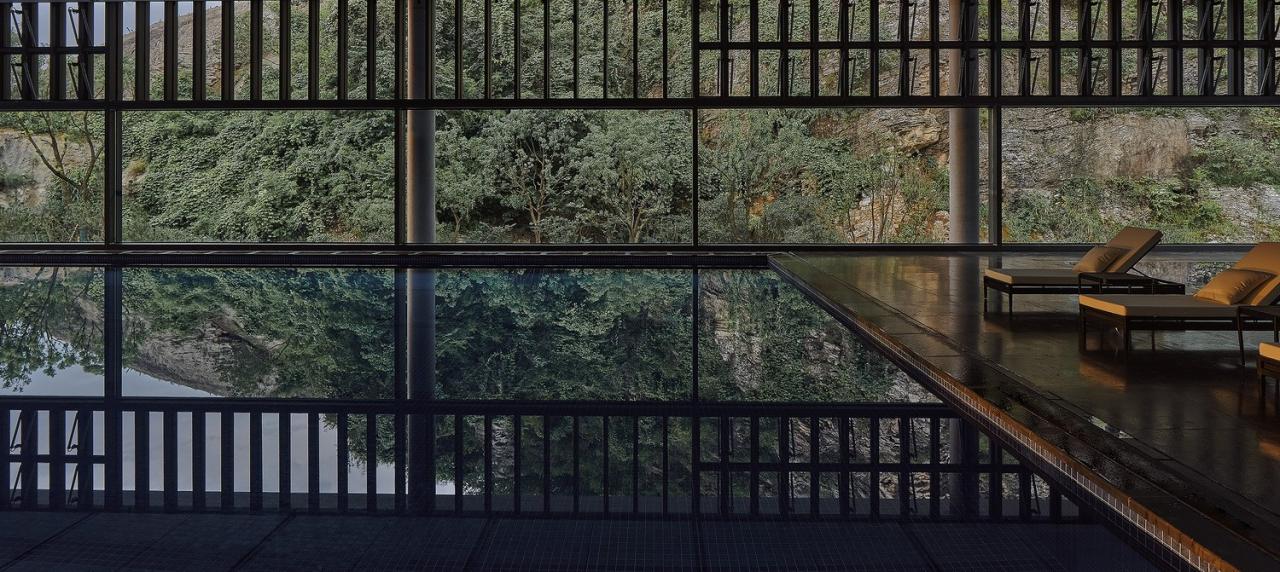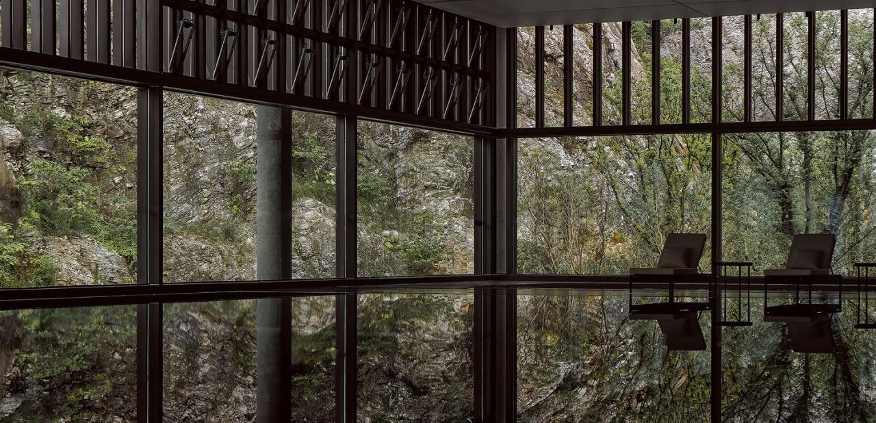 在这方空间中,自然是设计的主角——在山水的起伏回环之间,设计巧妙利用景致风光,尽最大可能打通室内外的界限——仿佛建筑从矿坑中自然生发出一般,虽由人作,宛自天然。